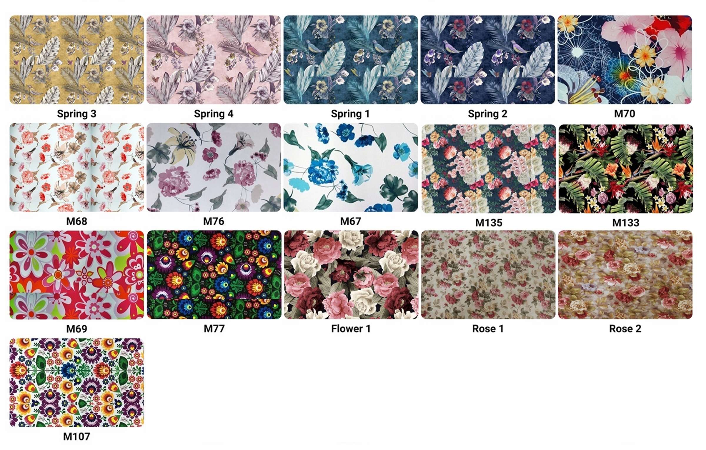 Wzory drukowane są na tkaninach welurowych i plecionkach. W skład kolekcji wchodzą wielobarwne motywy kwiatów. Fotel obity w tak efektowny wzór z pewnością ożywi każde wnętrze.