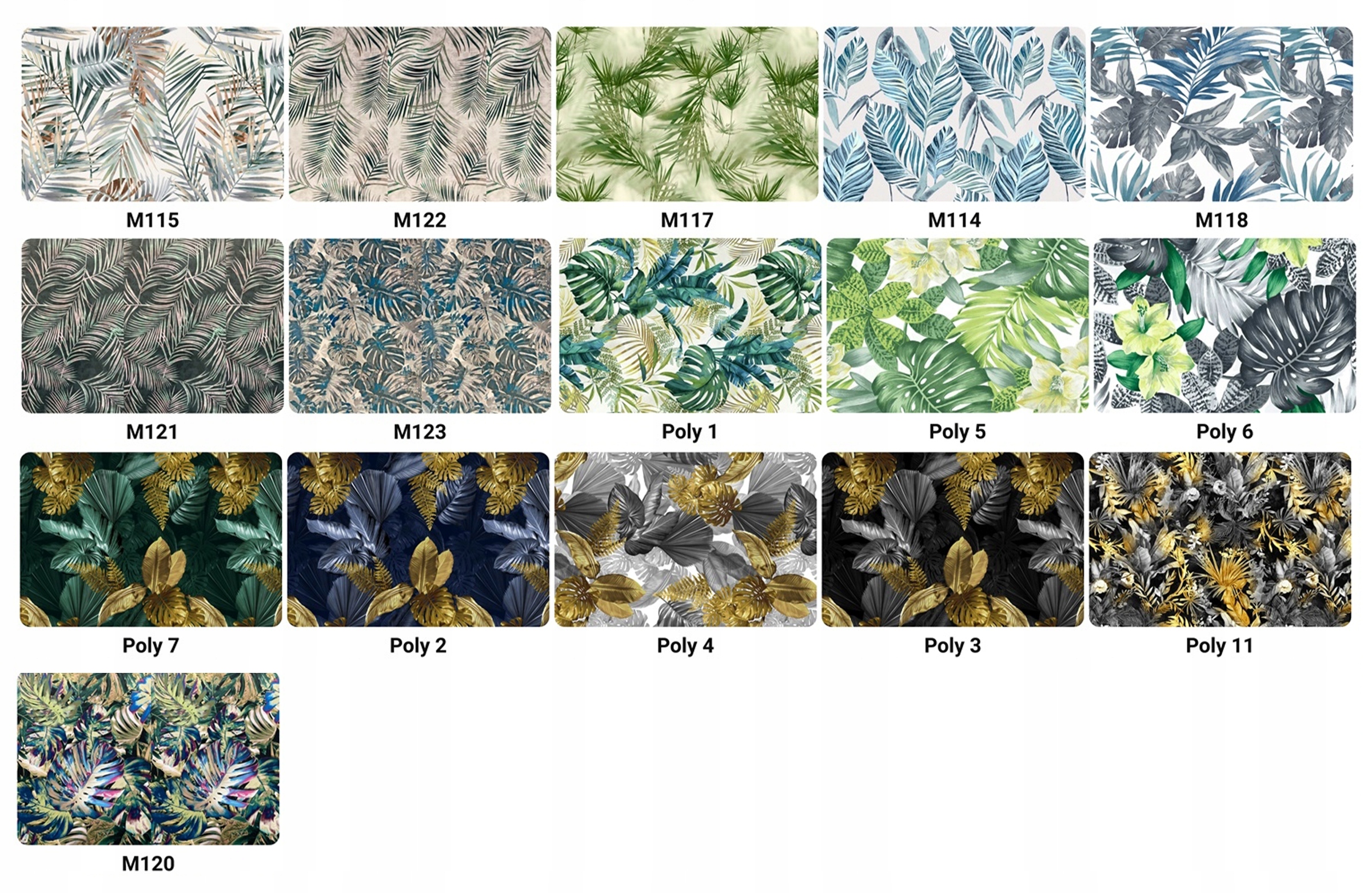 Wzory drukowane są na tkaninach welurowych i plecionkach. W skład kolekcji wchodzą wielobarwne motywy kwiatów. Fotel obity w tak efektowny wzór z pewnością ożywi każde wnętrze.