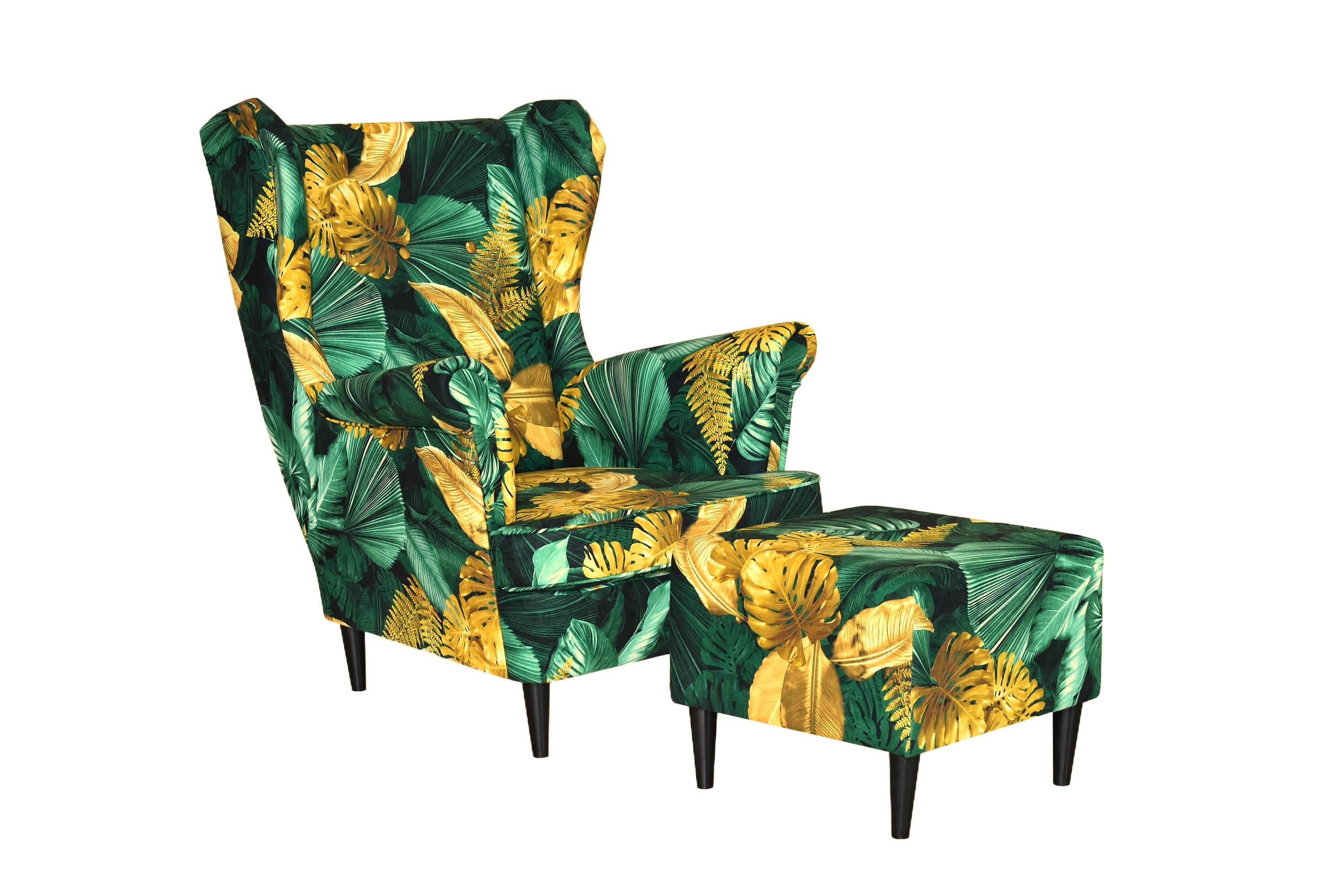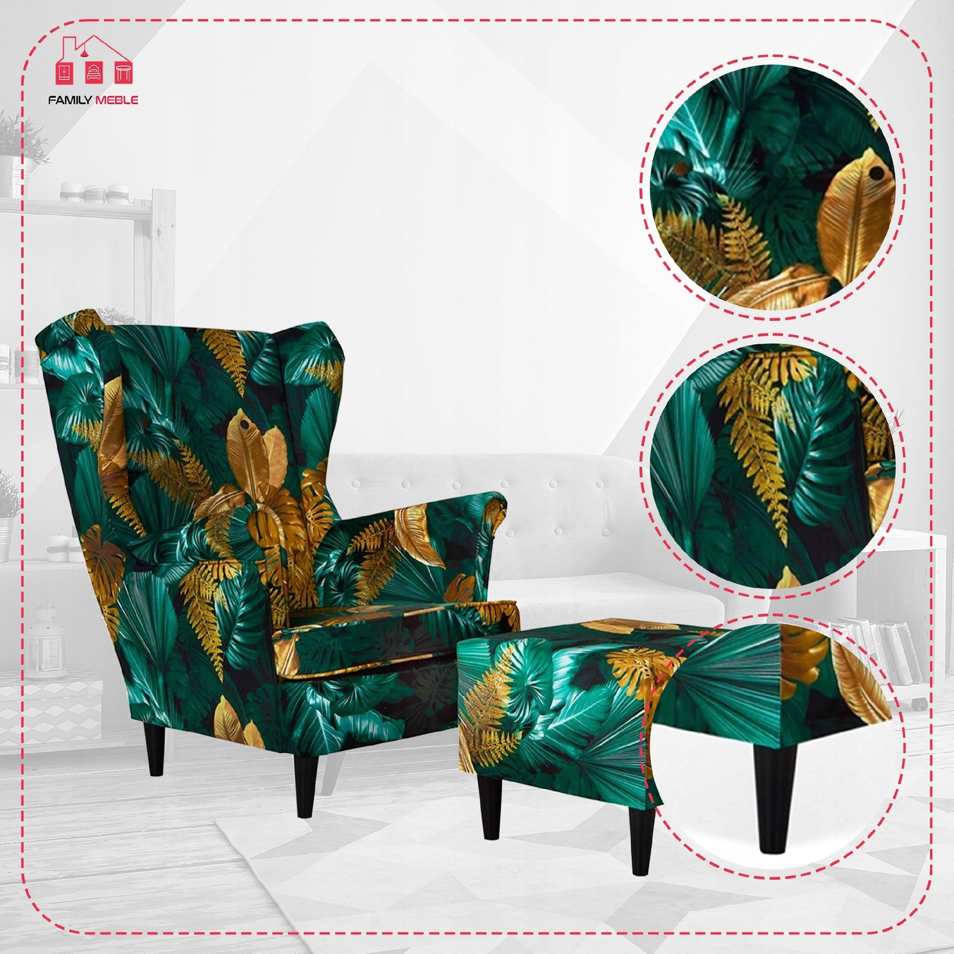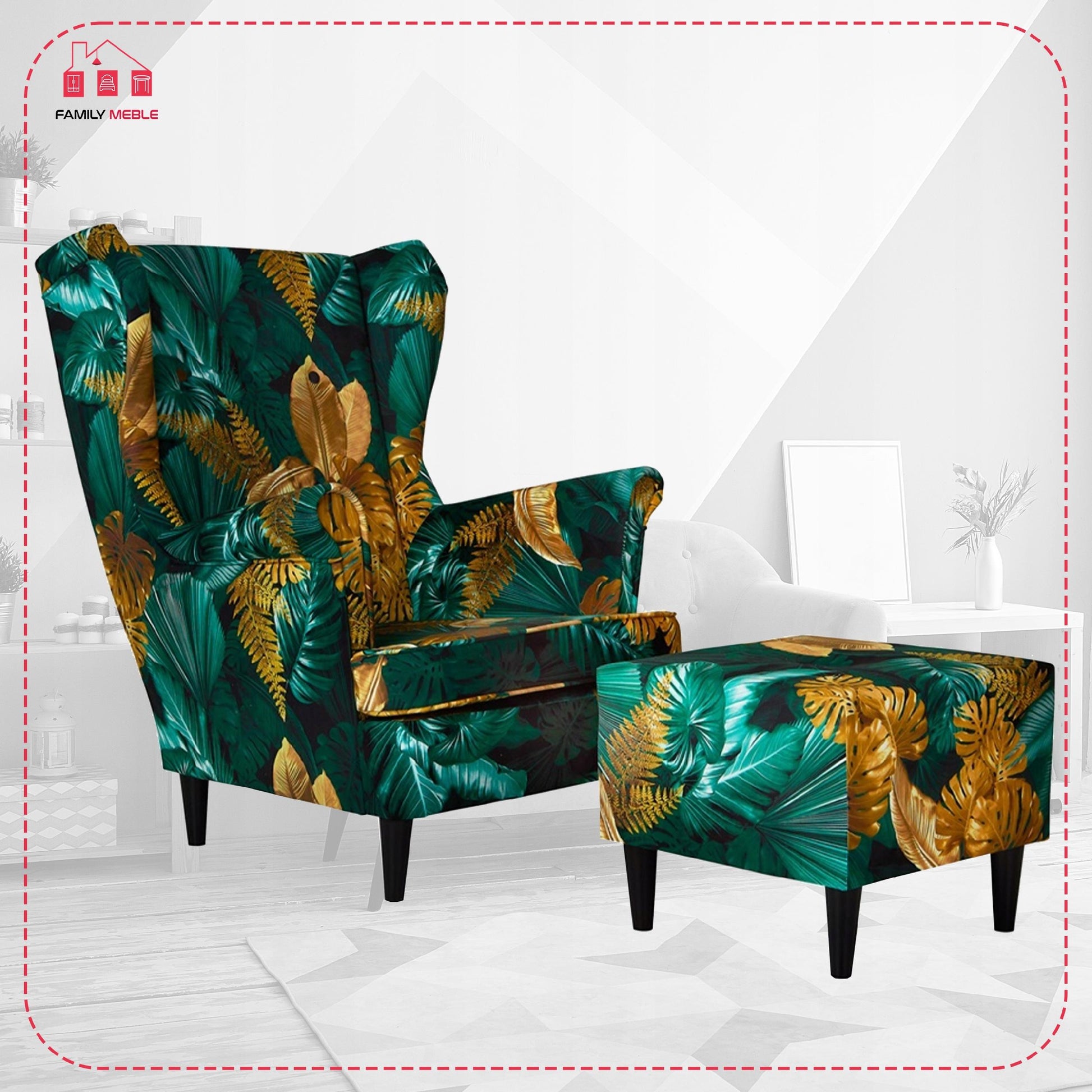 Fotel uszak ARI PRINT z podnóżkiem, skandynawski Family Meble zielony