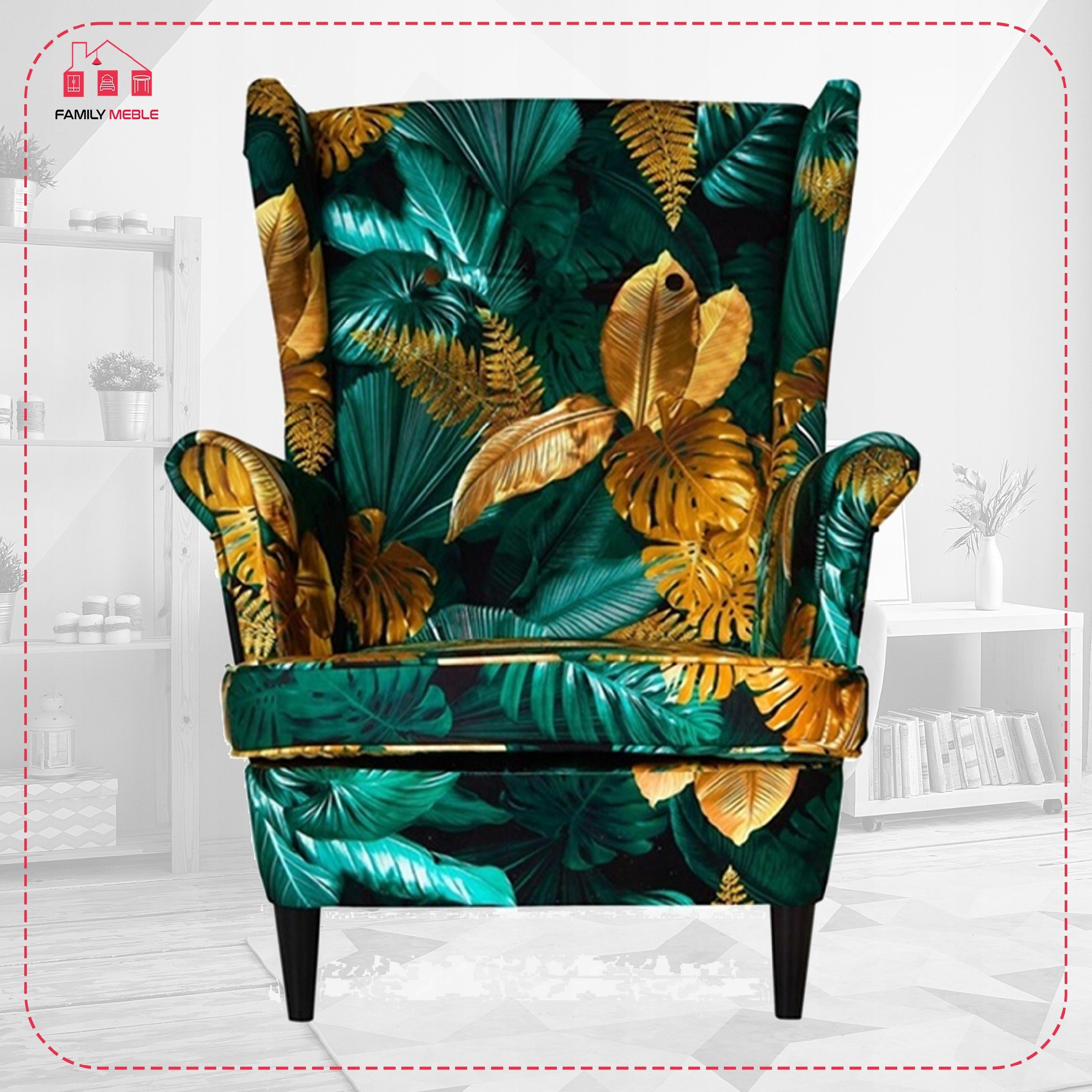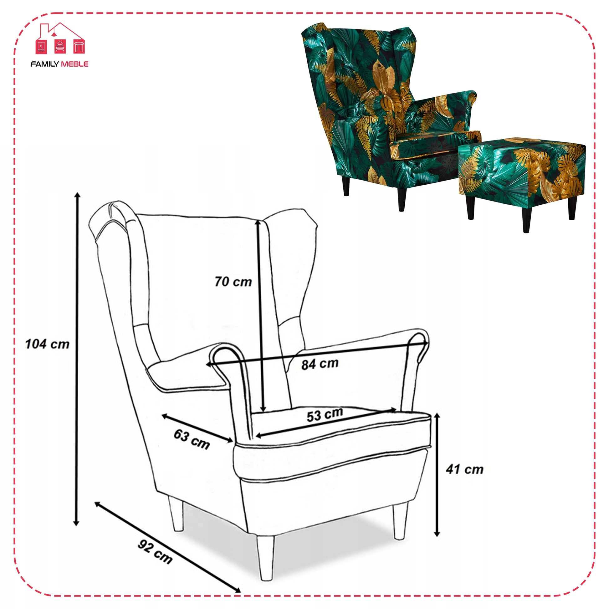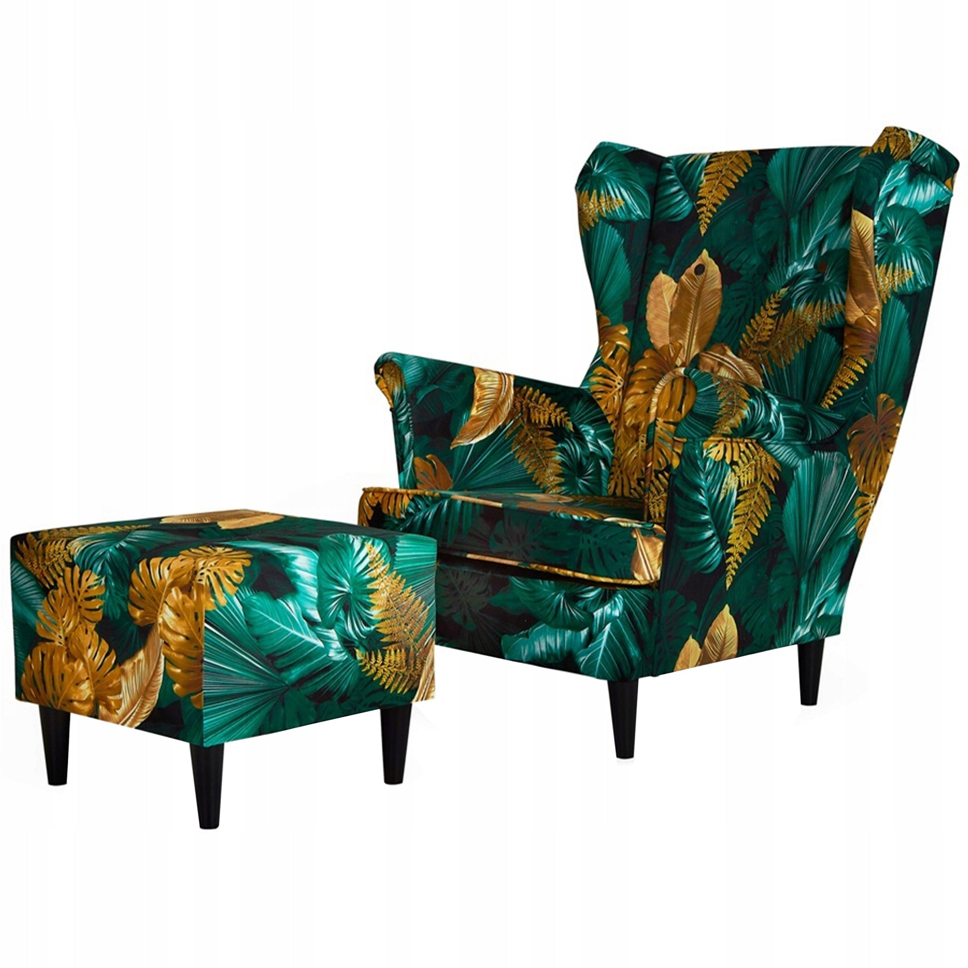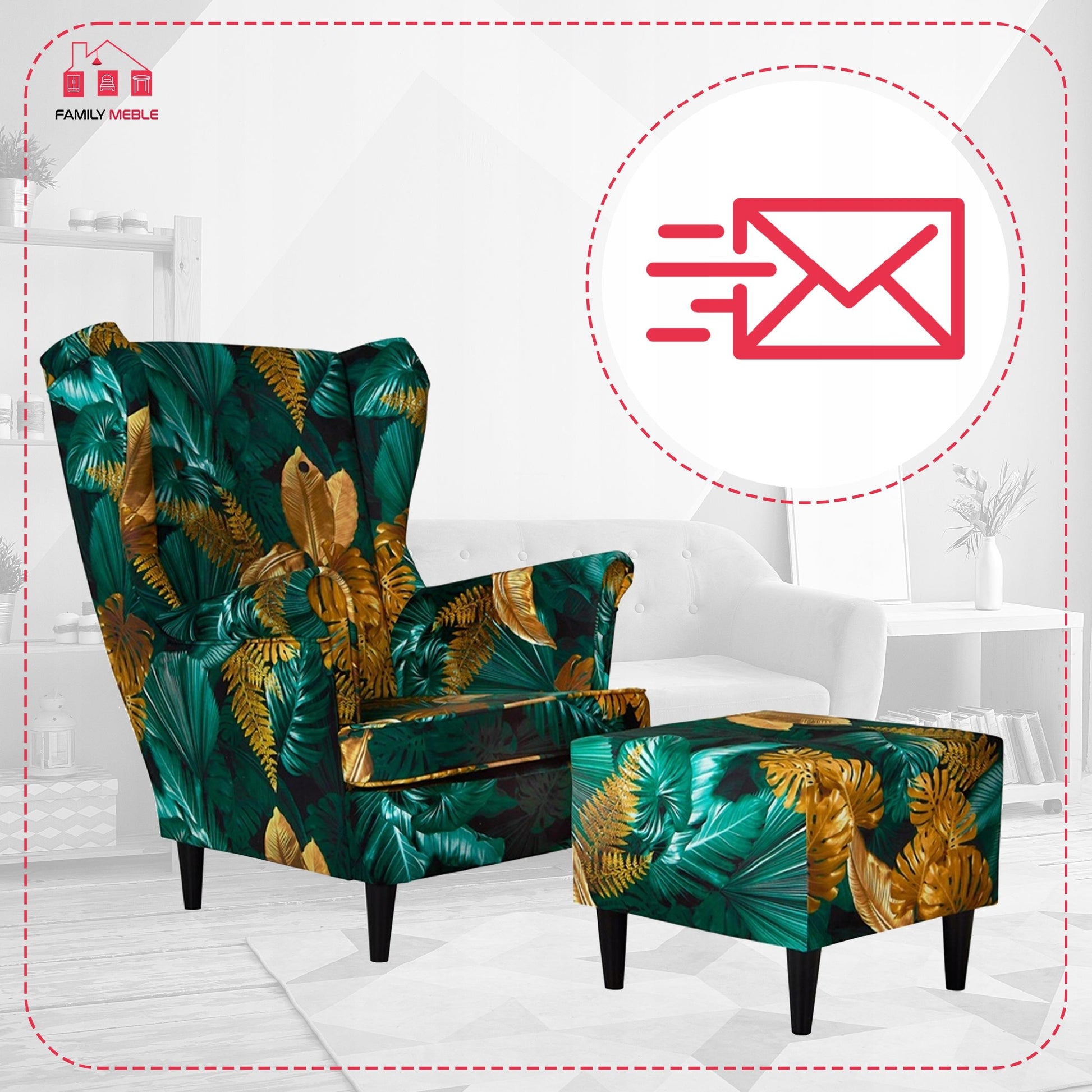 Fotel uszak ARI PRINT z podnóżkiem, skandynawski Family Meble zielony