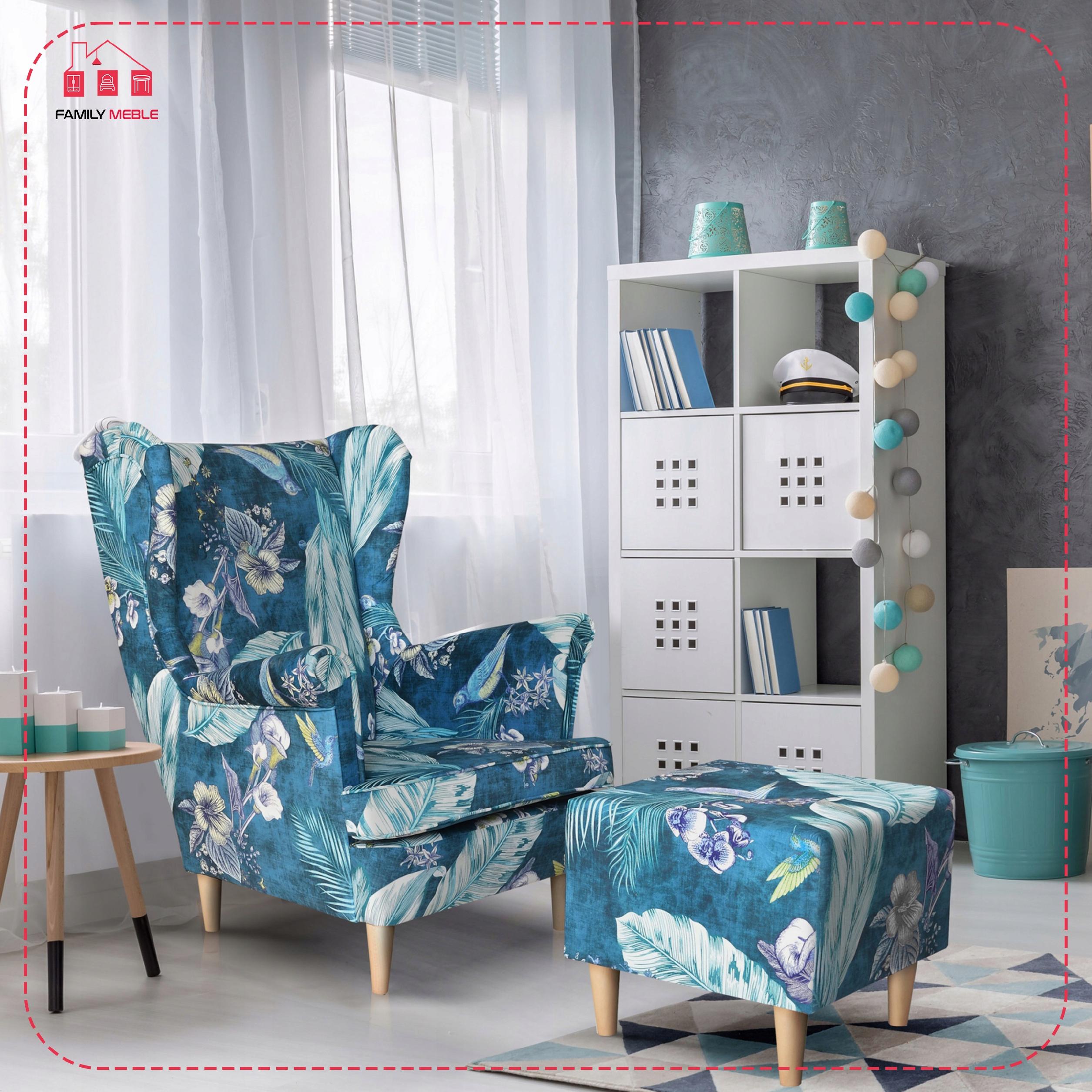 Fotel uszak z podnóżkiem skandynawski Ari Print Family Meble