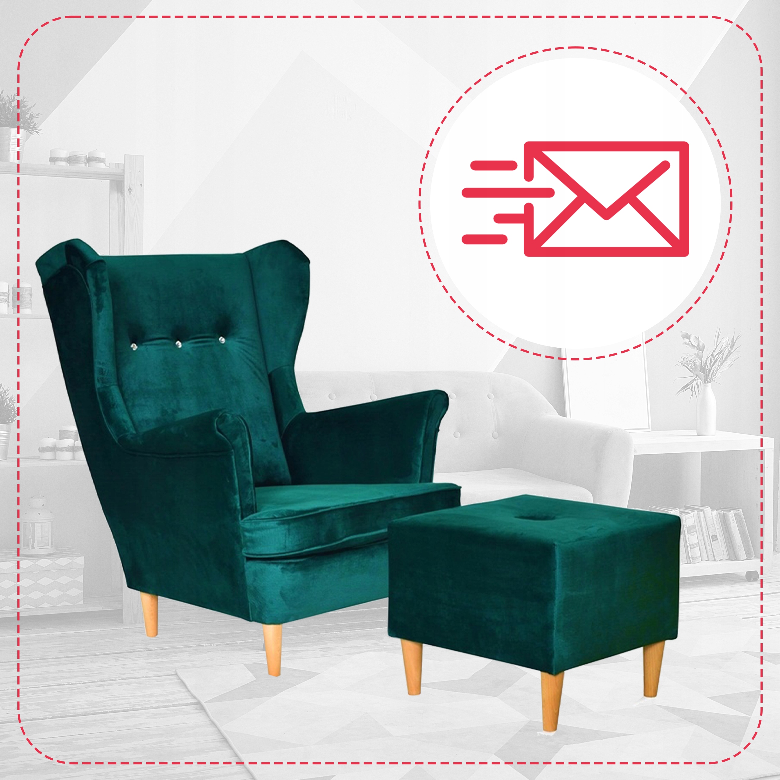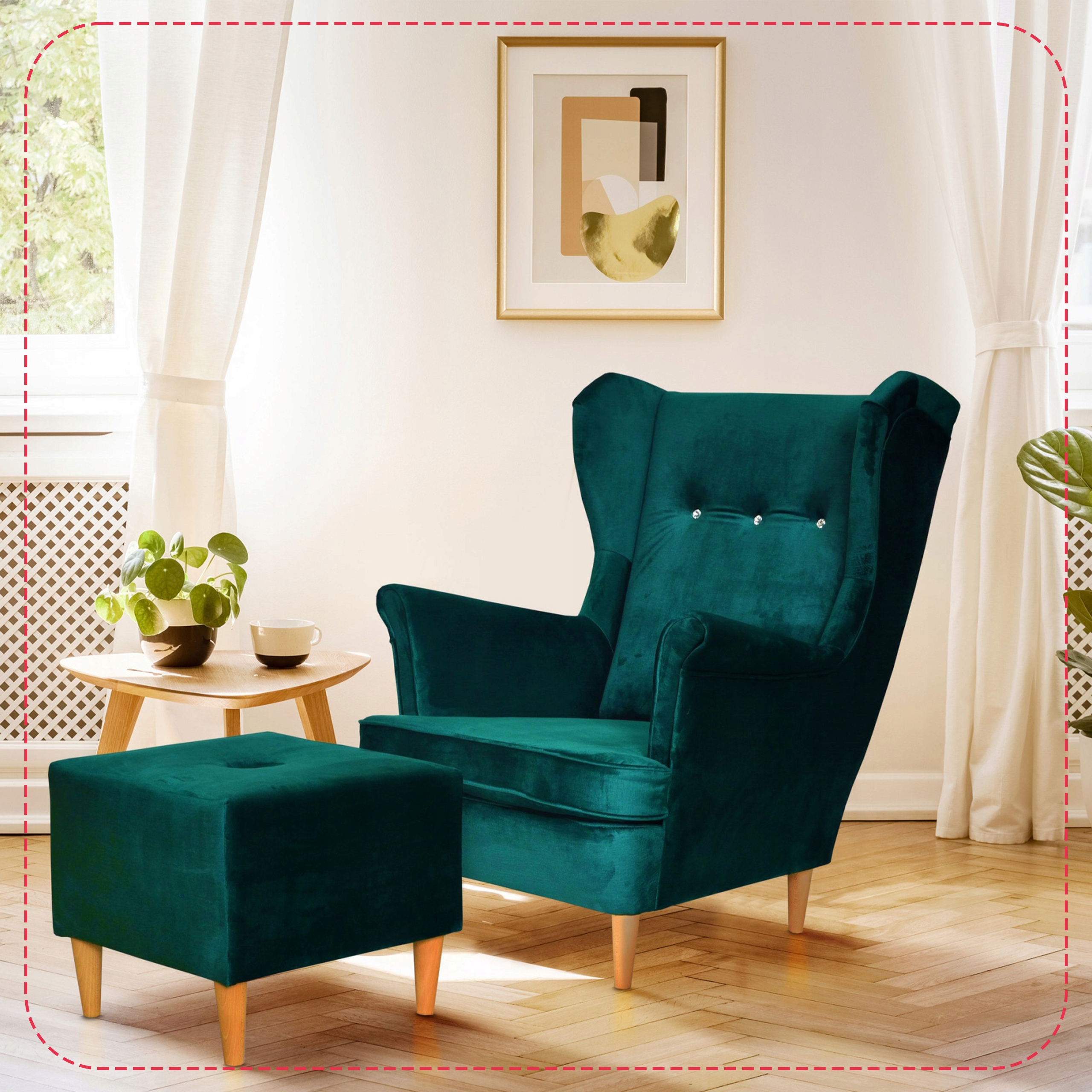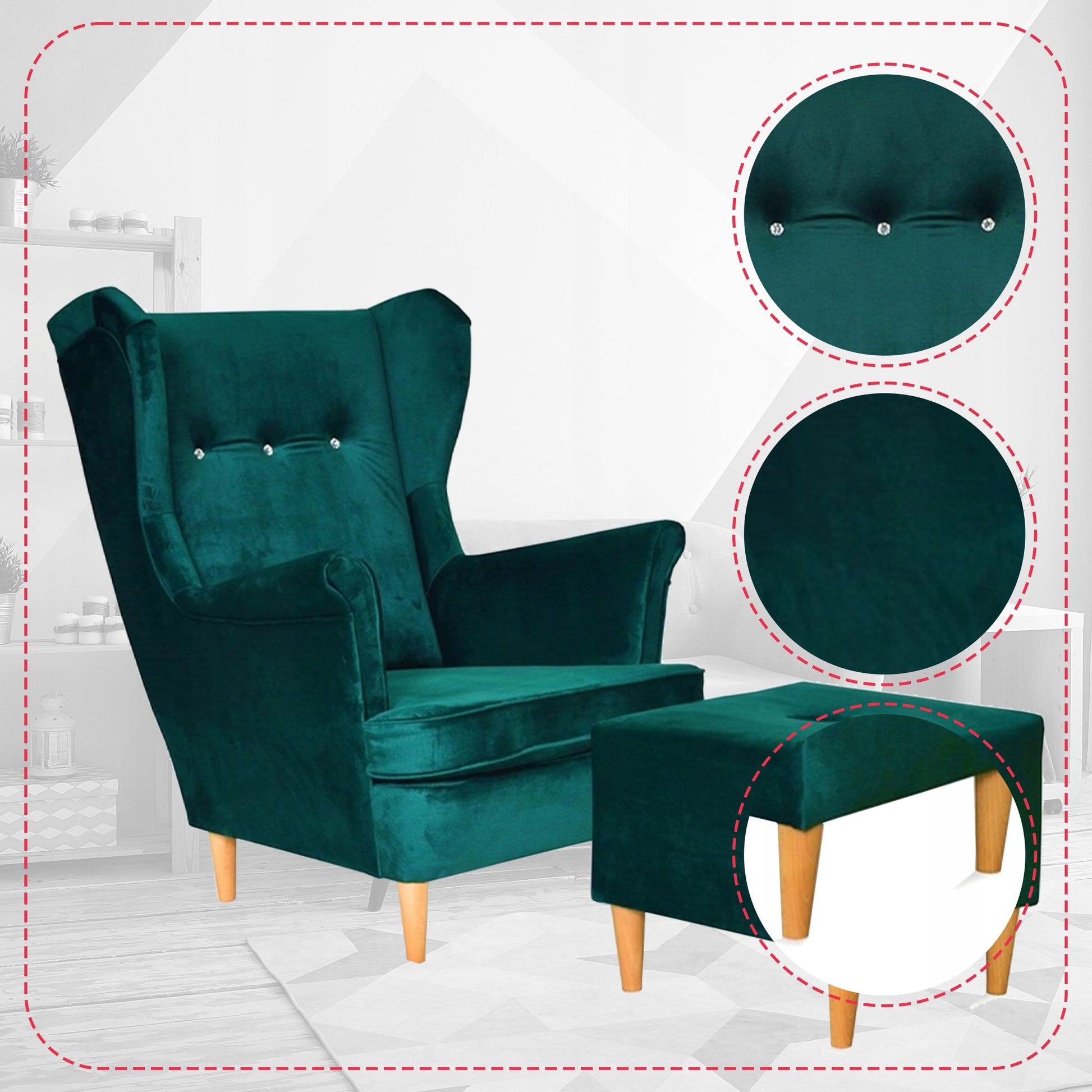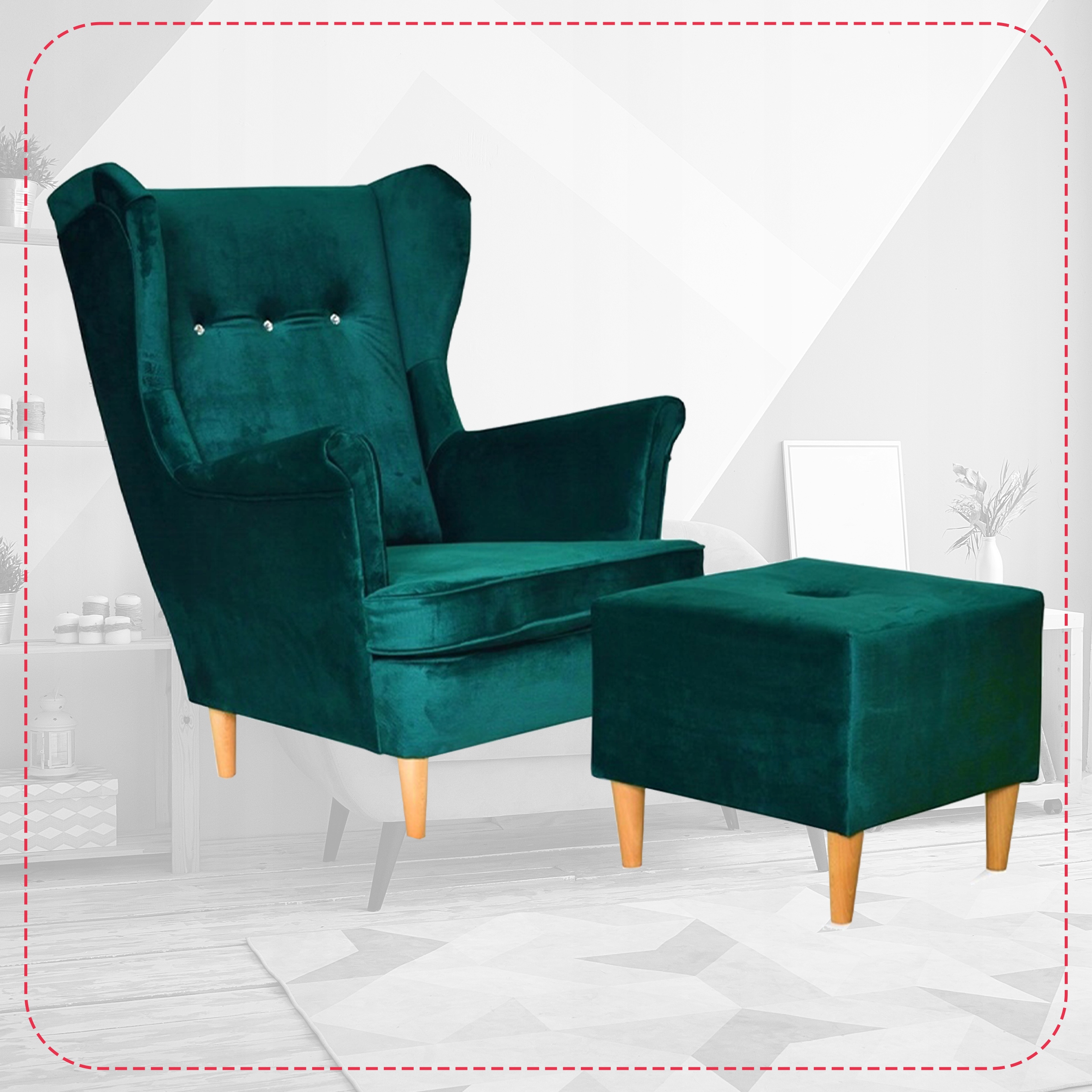 Fotel uszak ARI z podnóżkiem, skandynawski Family Meble ciemno zielony