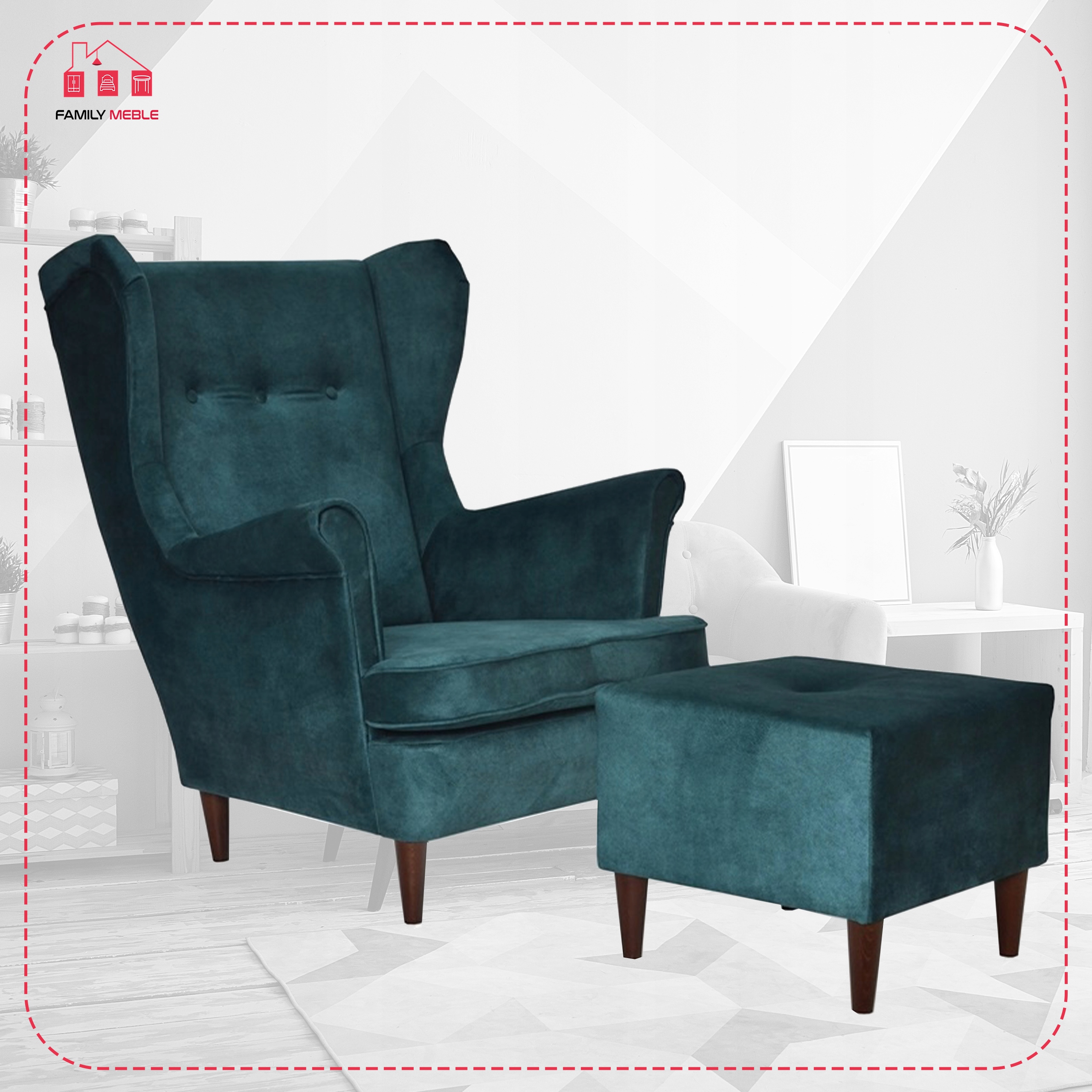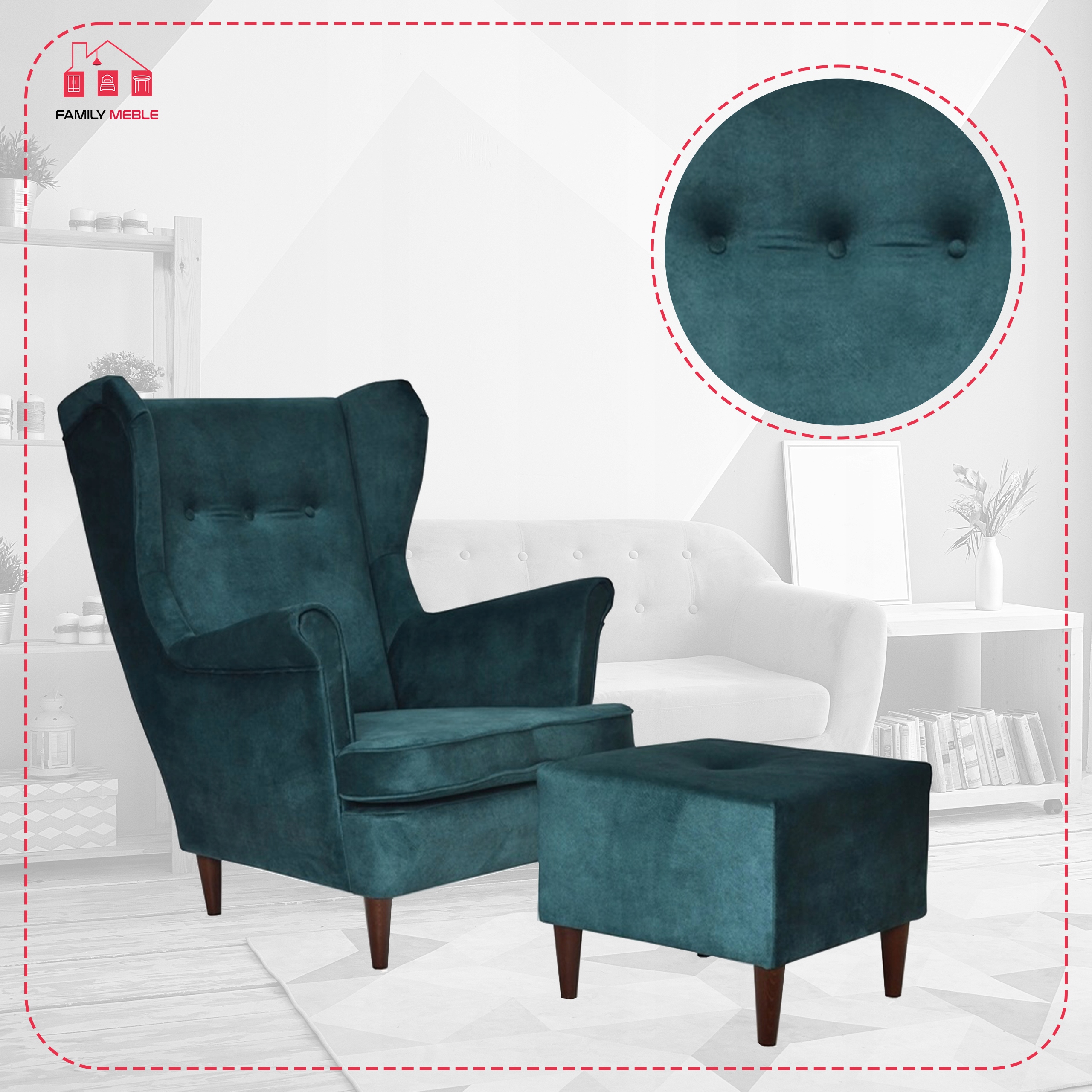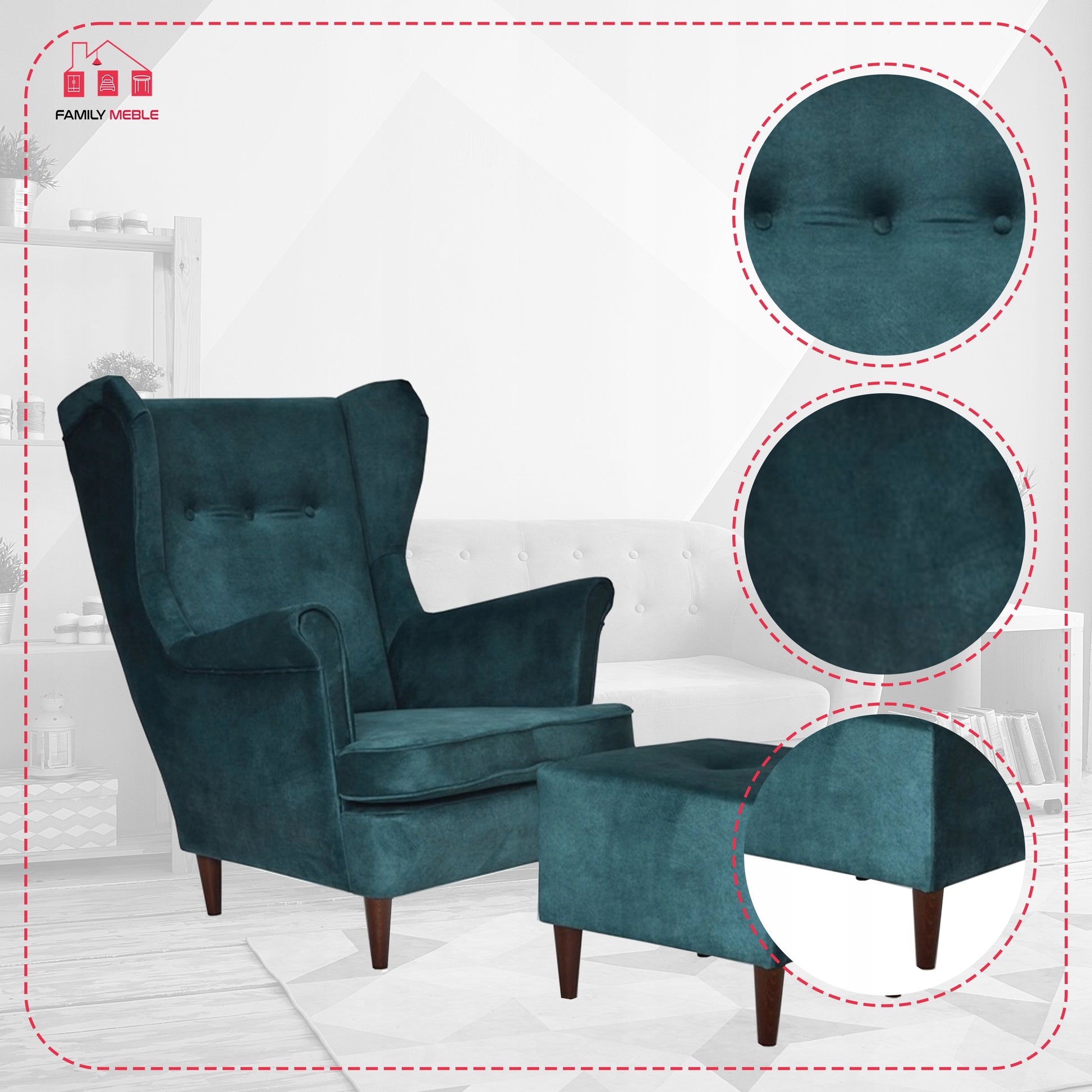 Fotel uszak ARI z podnóżkiem, skandynawski Family Meble ciemny turkus