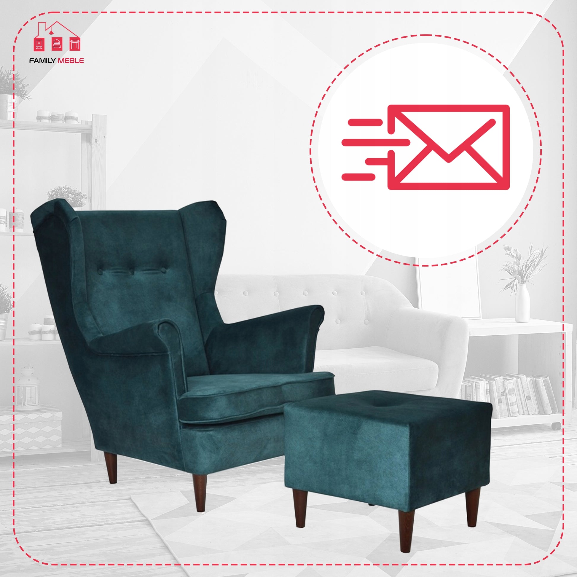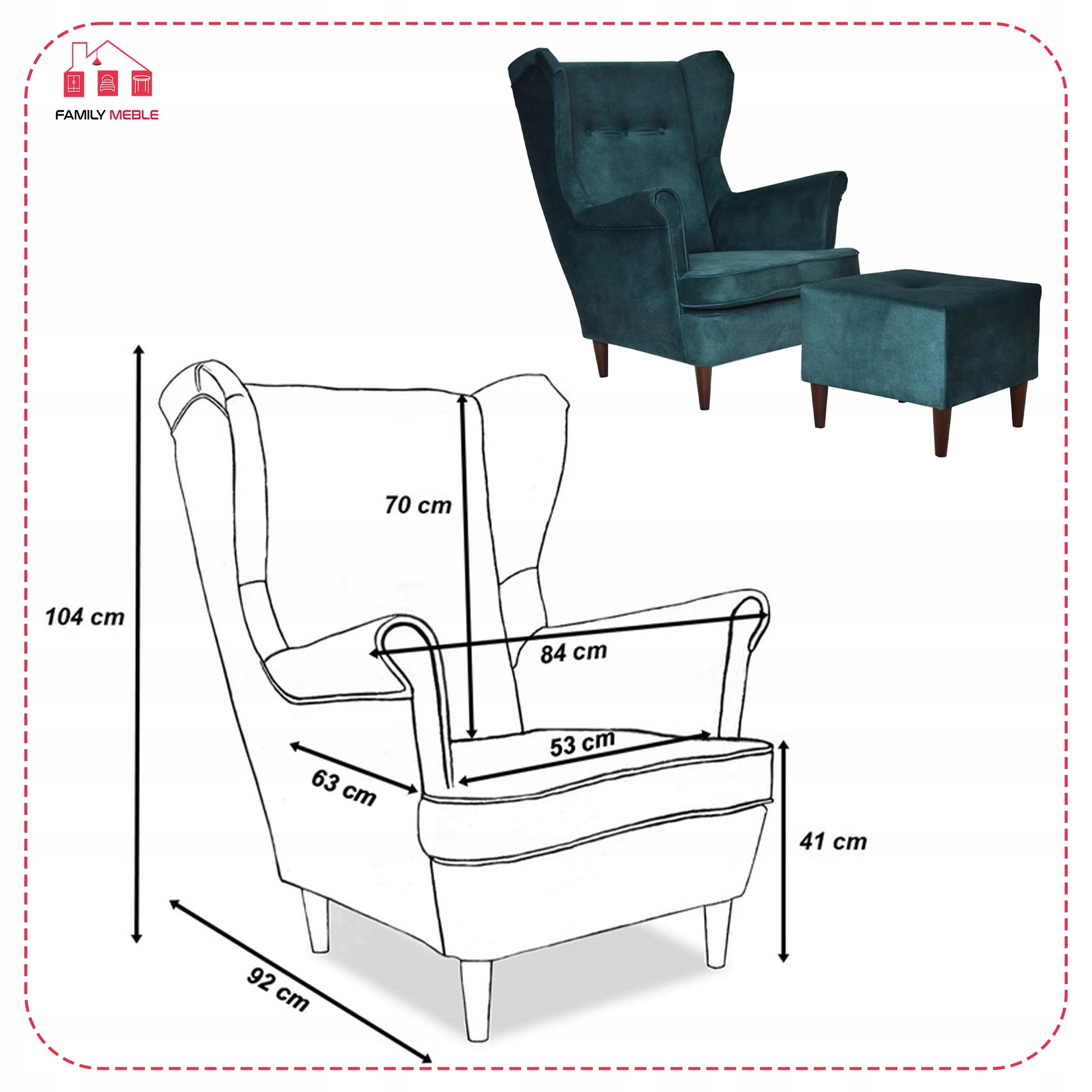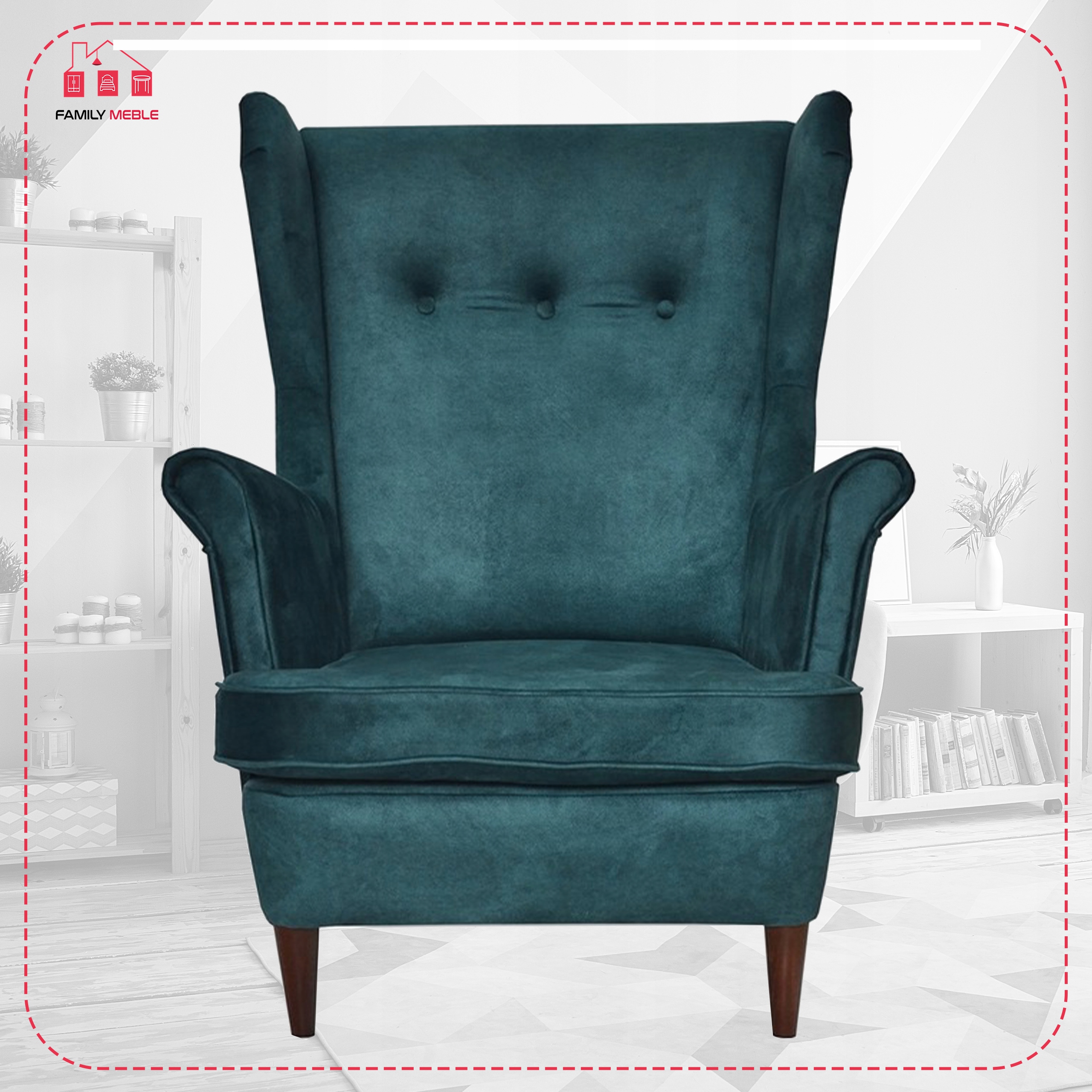 Fotel uszak ARI z podnóżkiem, skandynawski Family Meble ciemny turkus