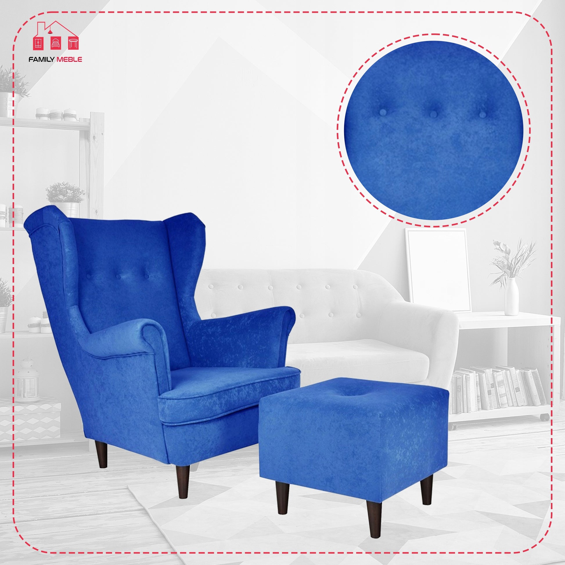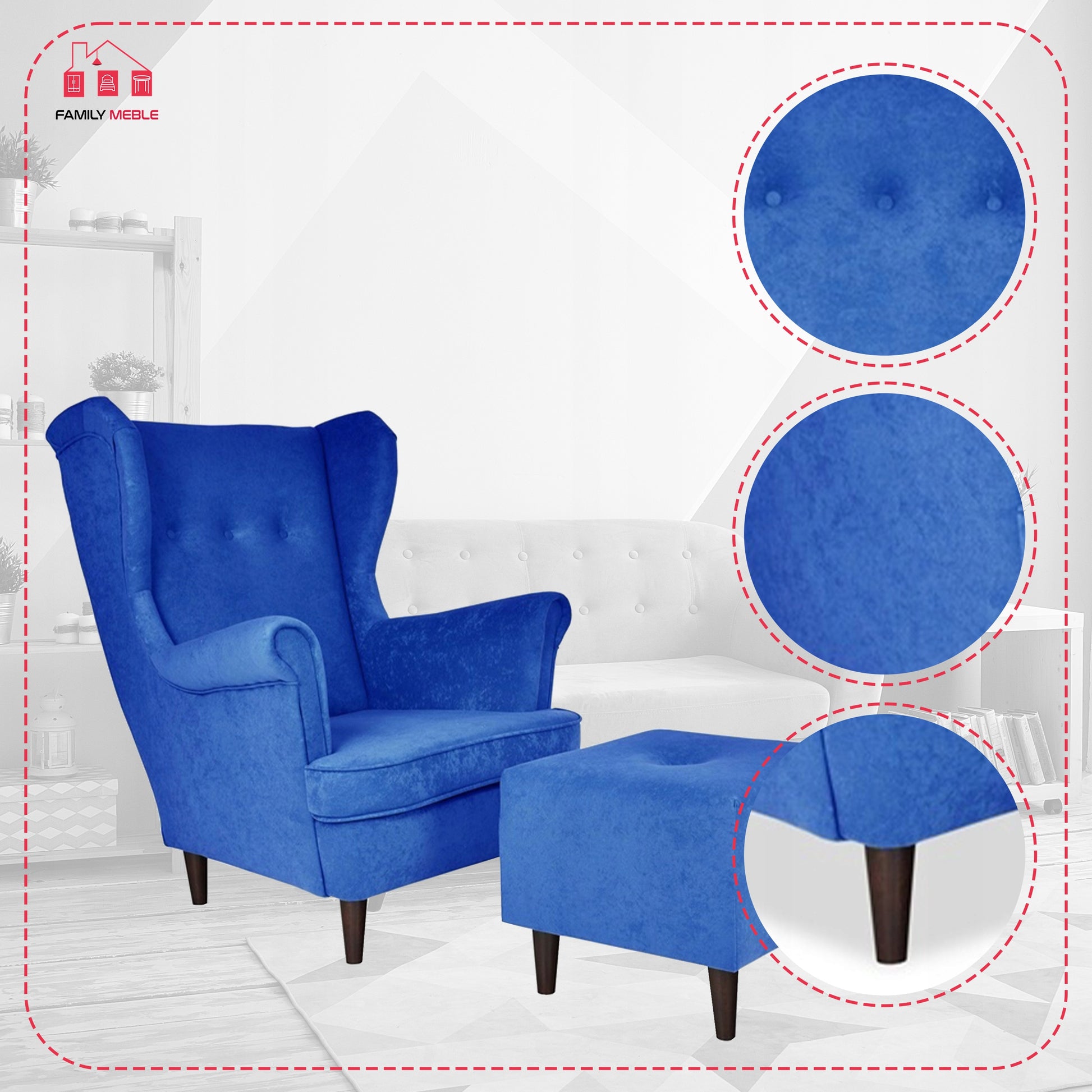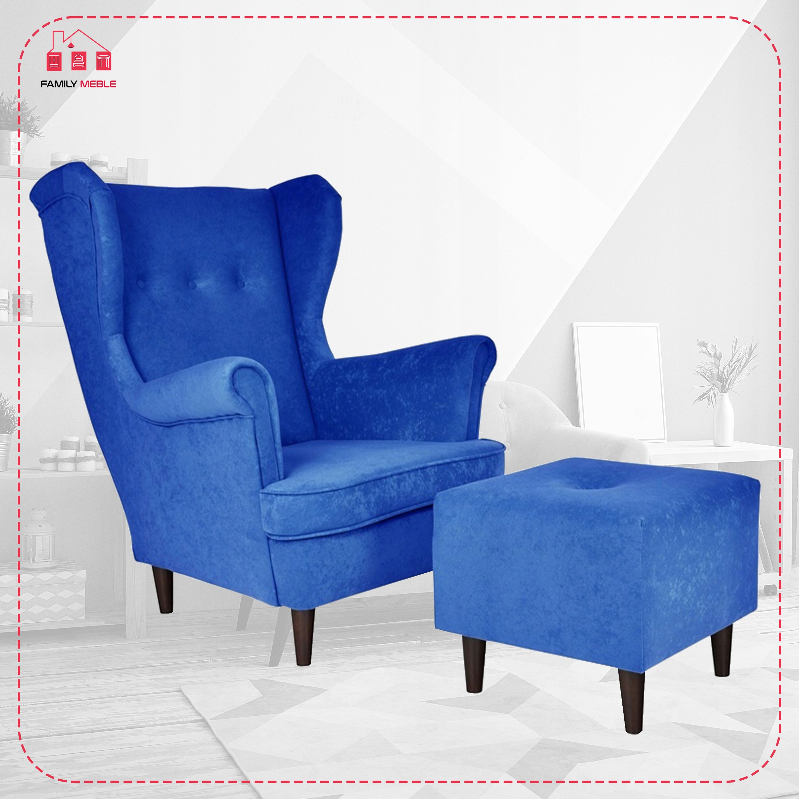 Fotel uszak ARI z podnóżkiem, welur niebieski do relaksu Family Meble