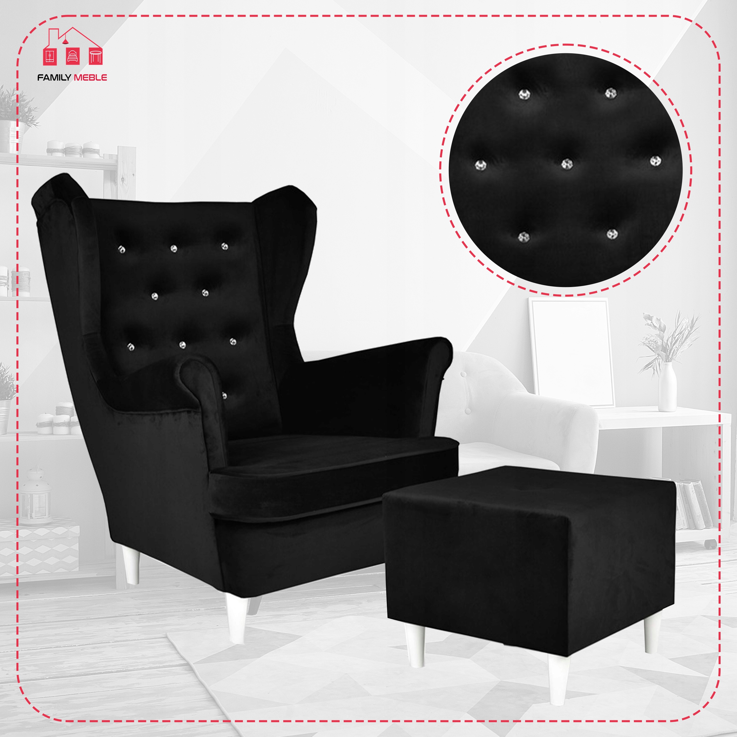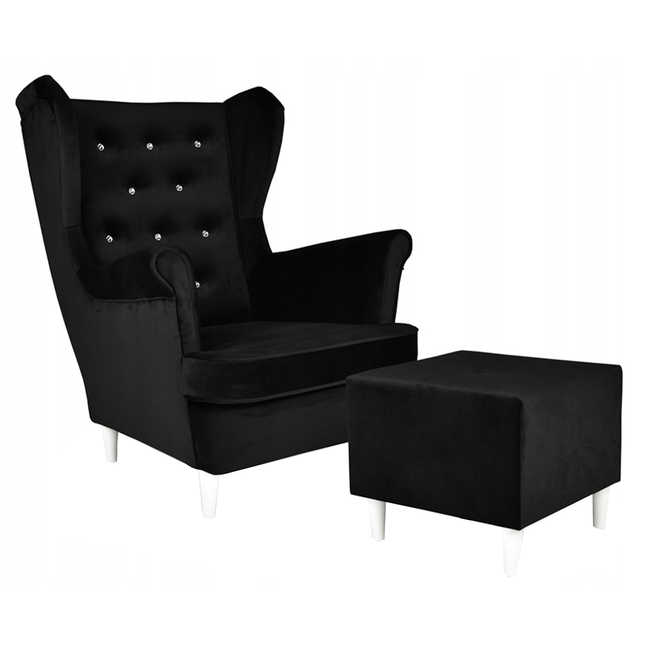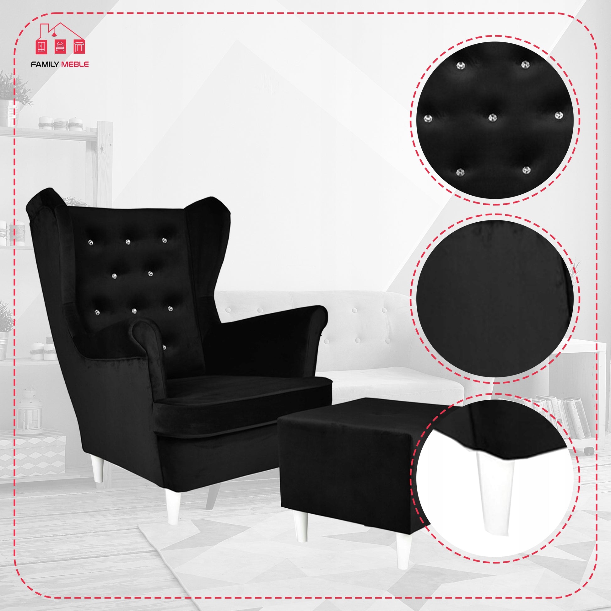Fotel uszak Diana z podnóżkiem, skandynawski Family Meble czarny welur