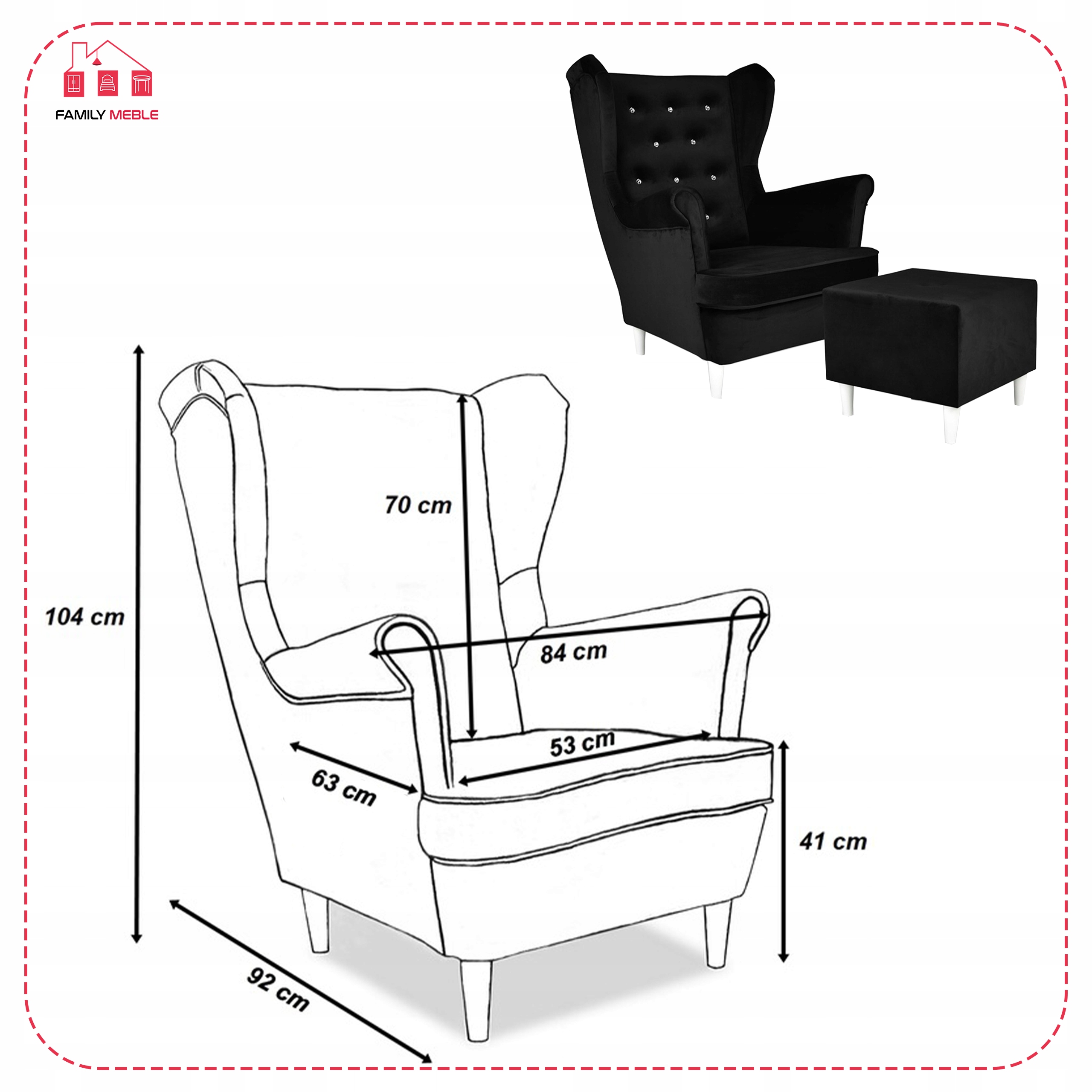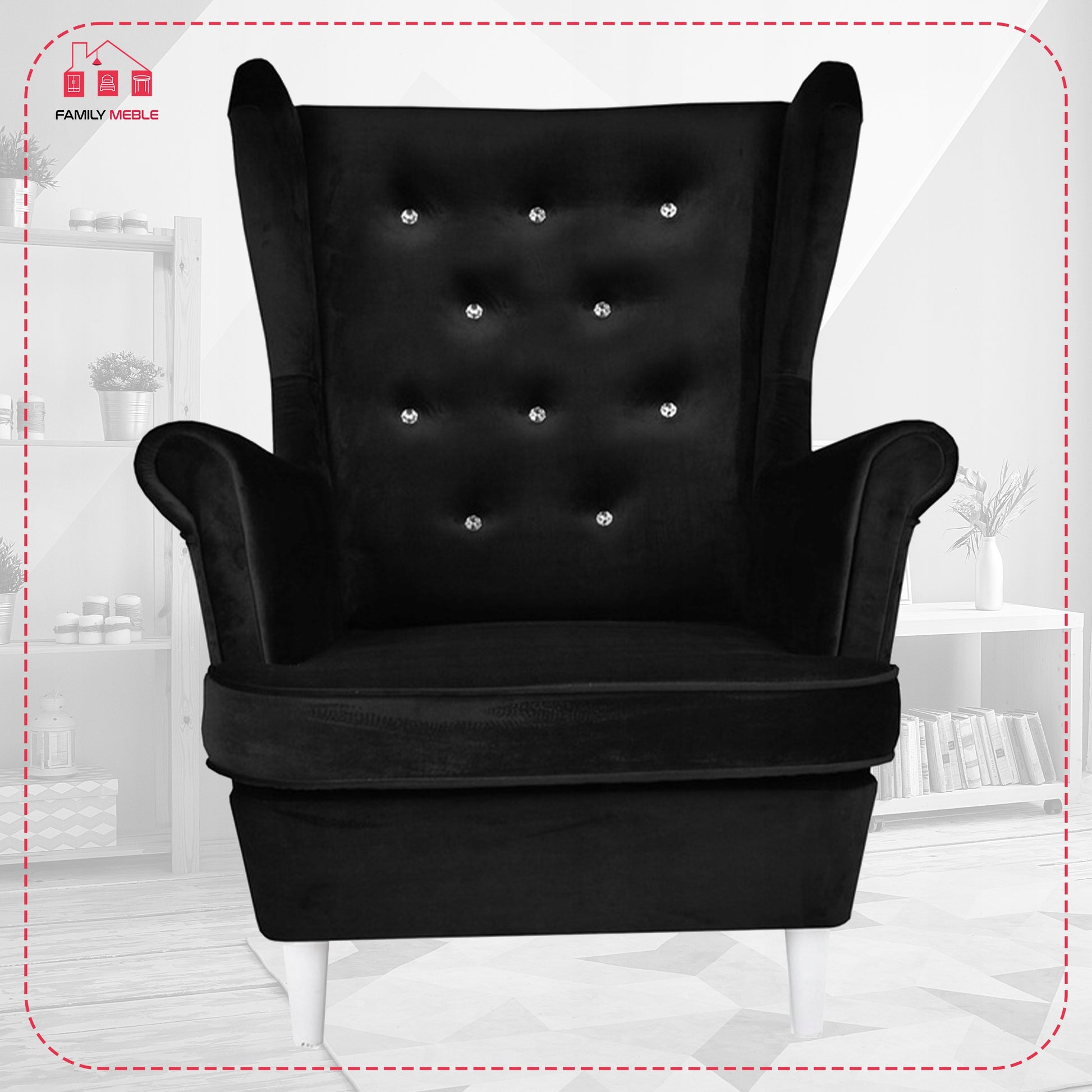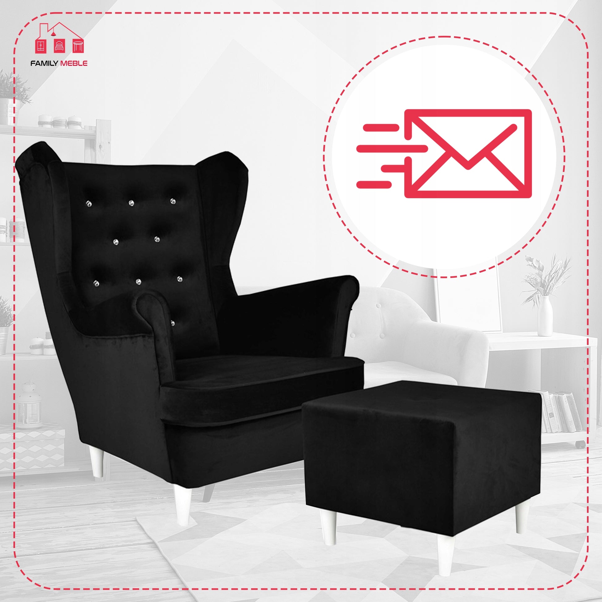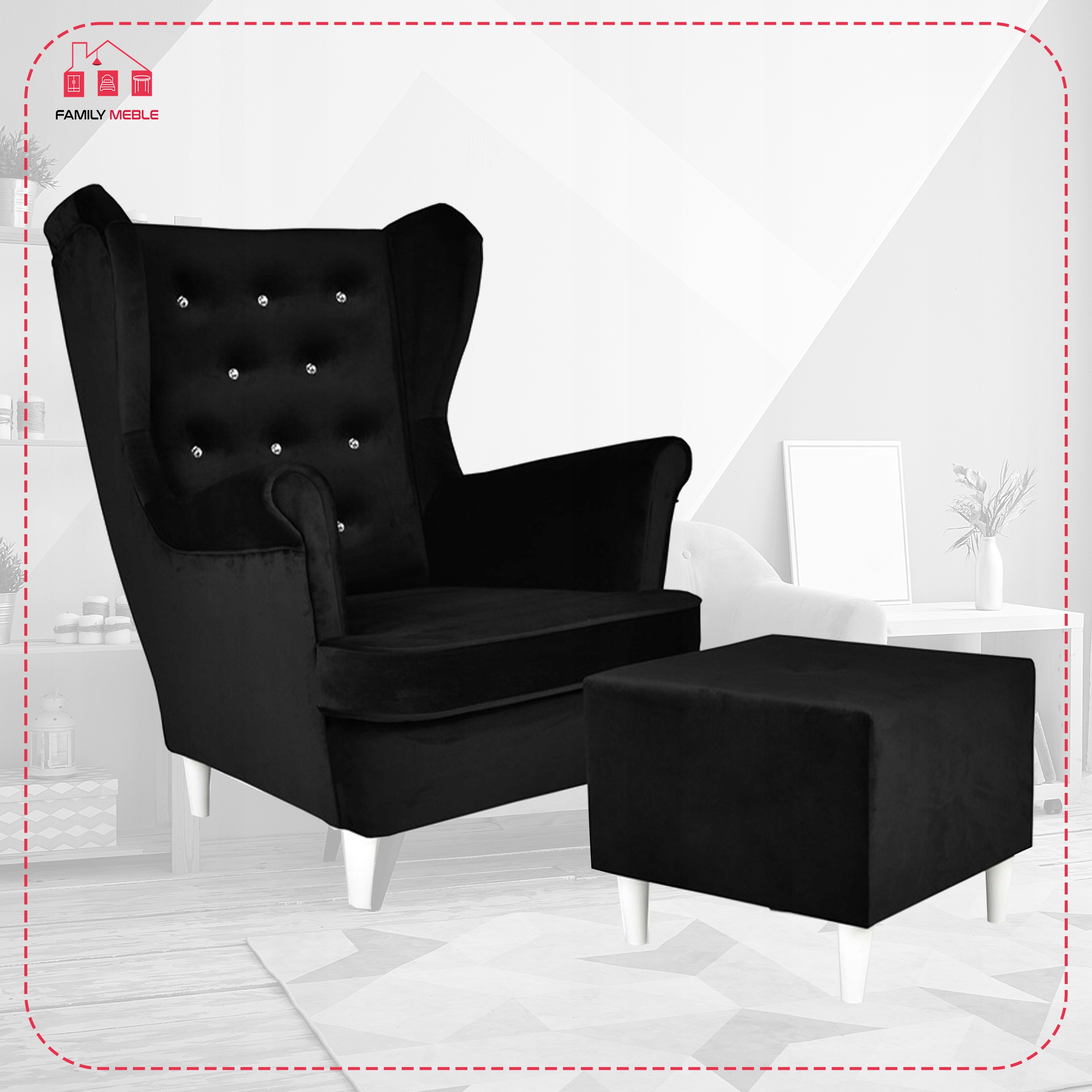 Fotel uszak Diana z podnóżkiem, skandynawski Family Meble czarny welur