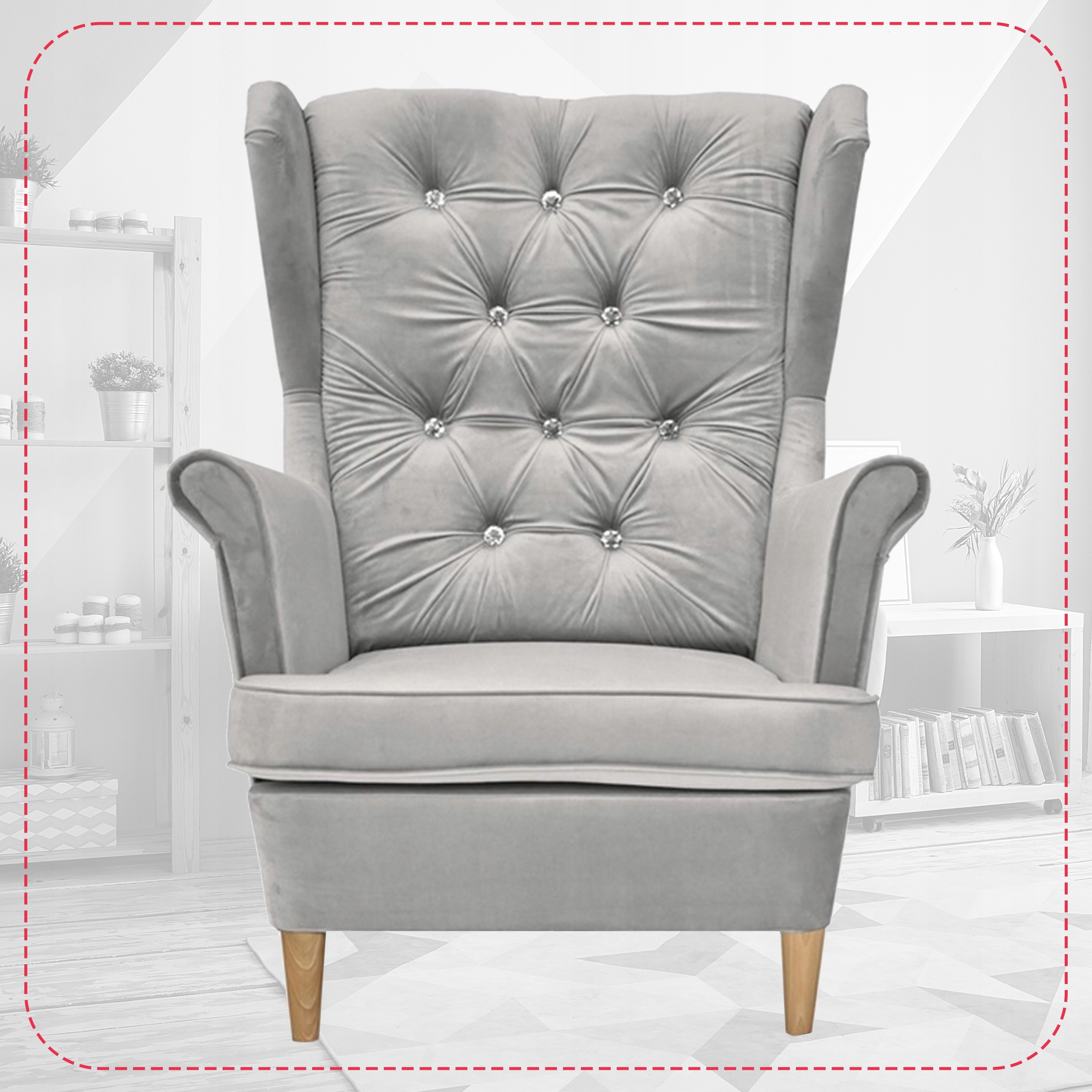 Oparcie fotela jest standardowo zdobione kryształkami Swarovskiego, istnieje jednak możliwość zamienienia ich na guziki materiałowe. W przypadku zainteresowania ozdobą tego rodzaju, poinformuj nas o tym w Wiadomości do Sprzedającego.