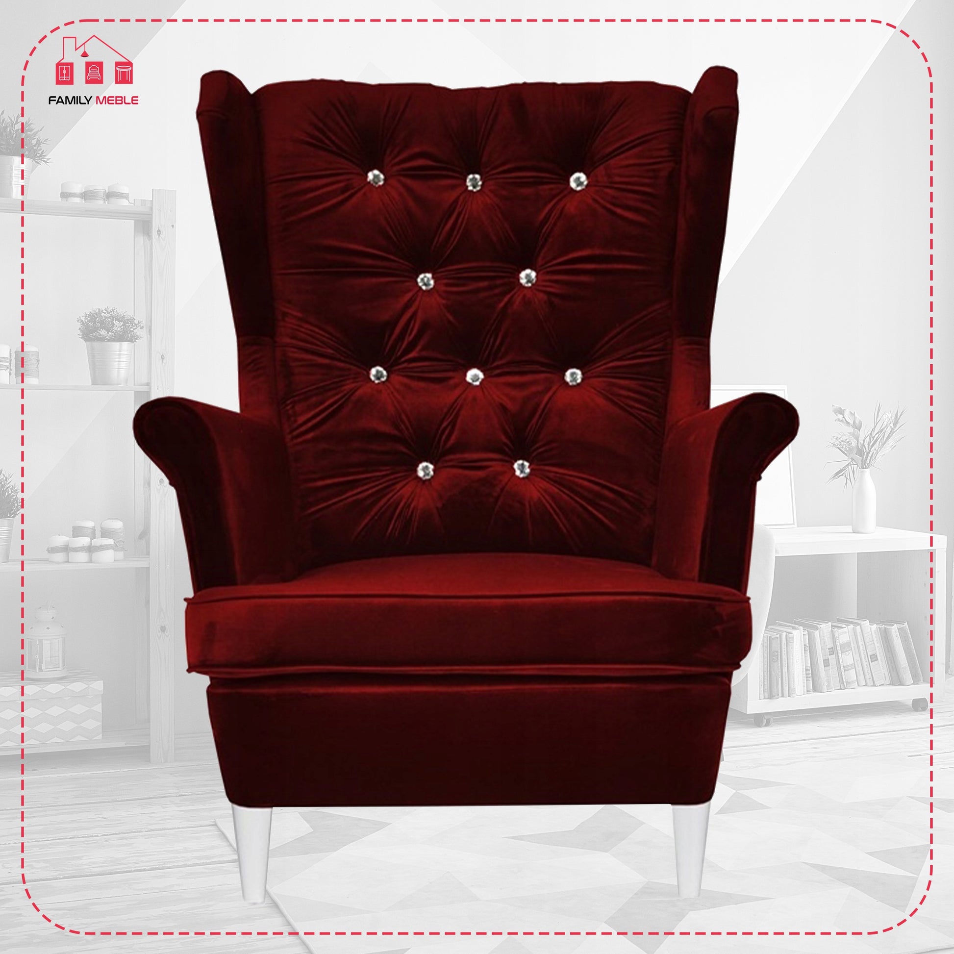 Oparcie fotela jest standardowo zdobione kryształkami Swarovskiego, istnieje jednak możliwość zamienienia ich na guziki materiałowe. W przypadku zainteresowania ozdobą tego rodzaju, poinformuj nas o tym w Wiadomości do Sprzedającego.