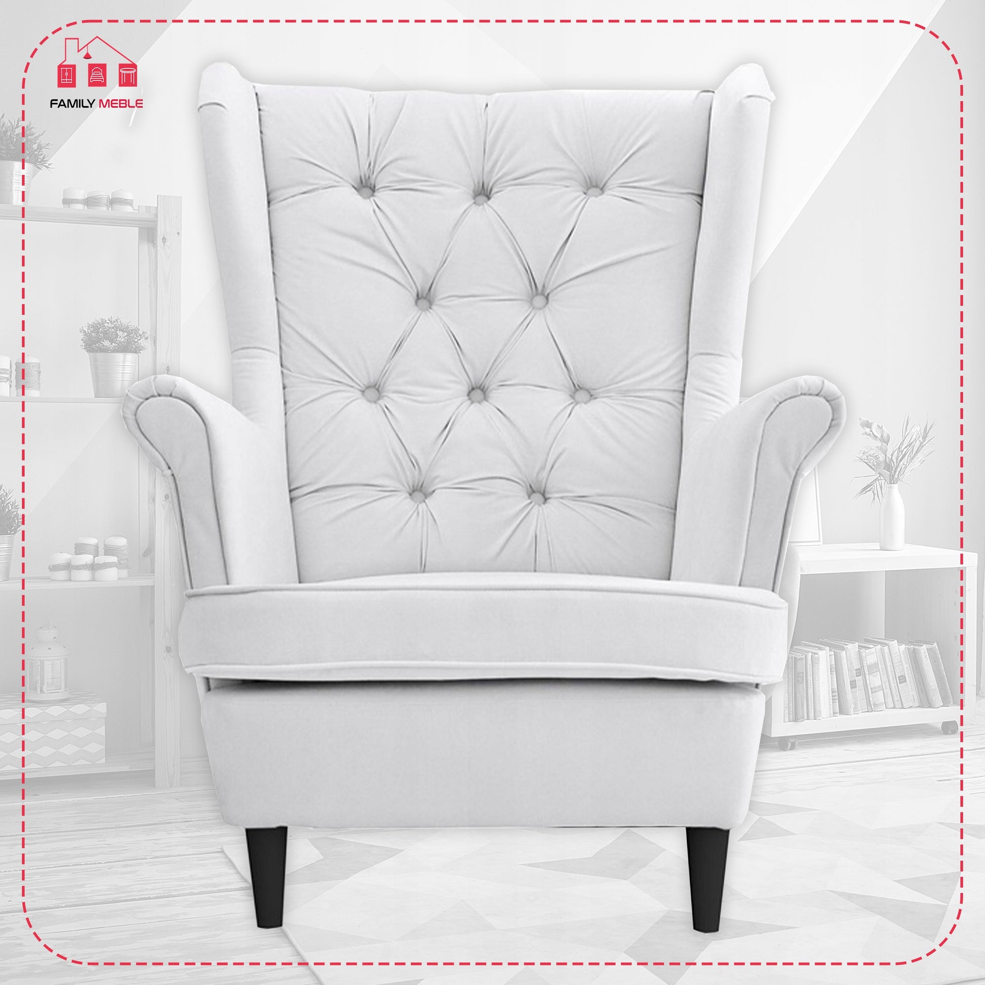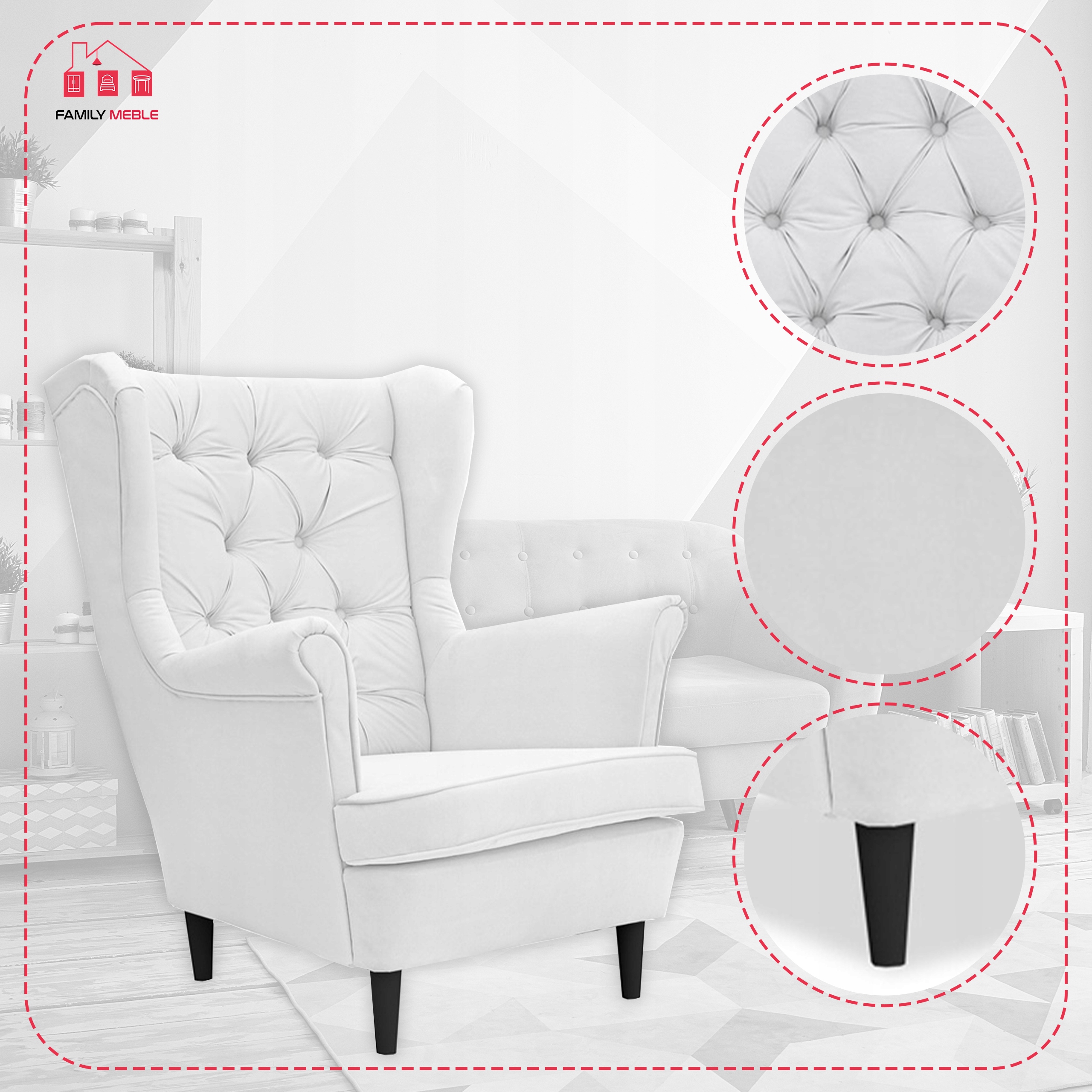 Fotel uszak Gaja skandynawski Famil Meble głęboko pikowana brudna biel