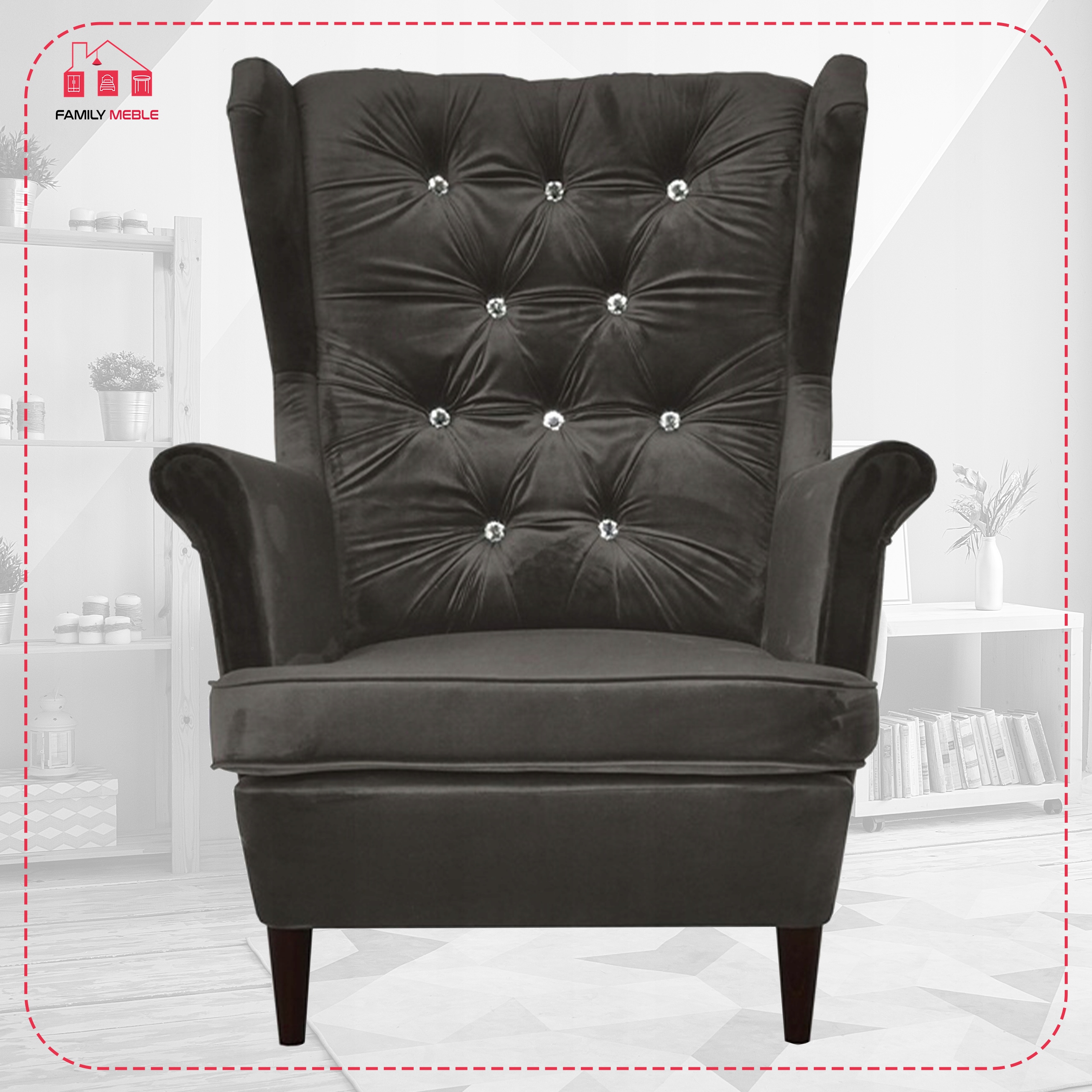Oparcie fotela jest standardowo zdobione kryształkami Swarovskiego, istnieje jednak możliwość zamienienia ich na guziki materiałowe. W przypadku zainteresowania ozdobą tego rodzaju, poinformuj nas o tym w Wiadomości do Sprzedającego.