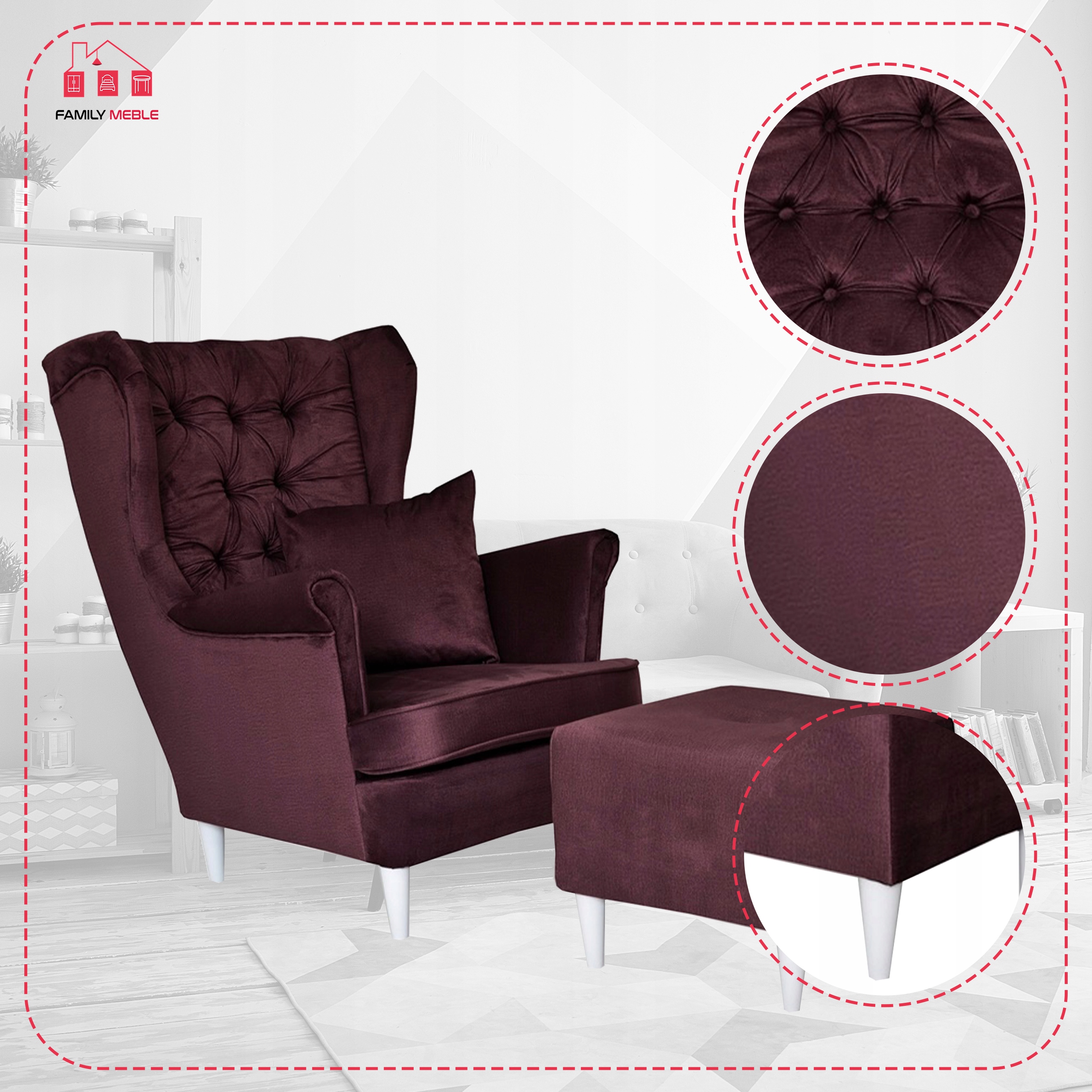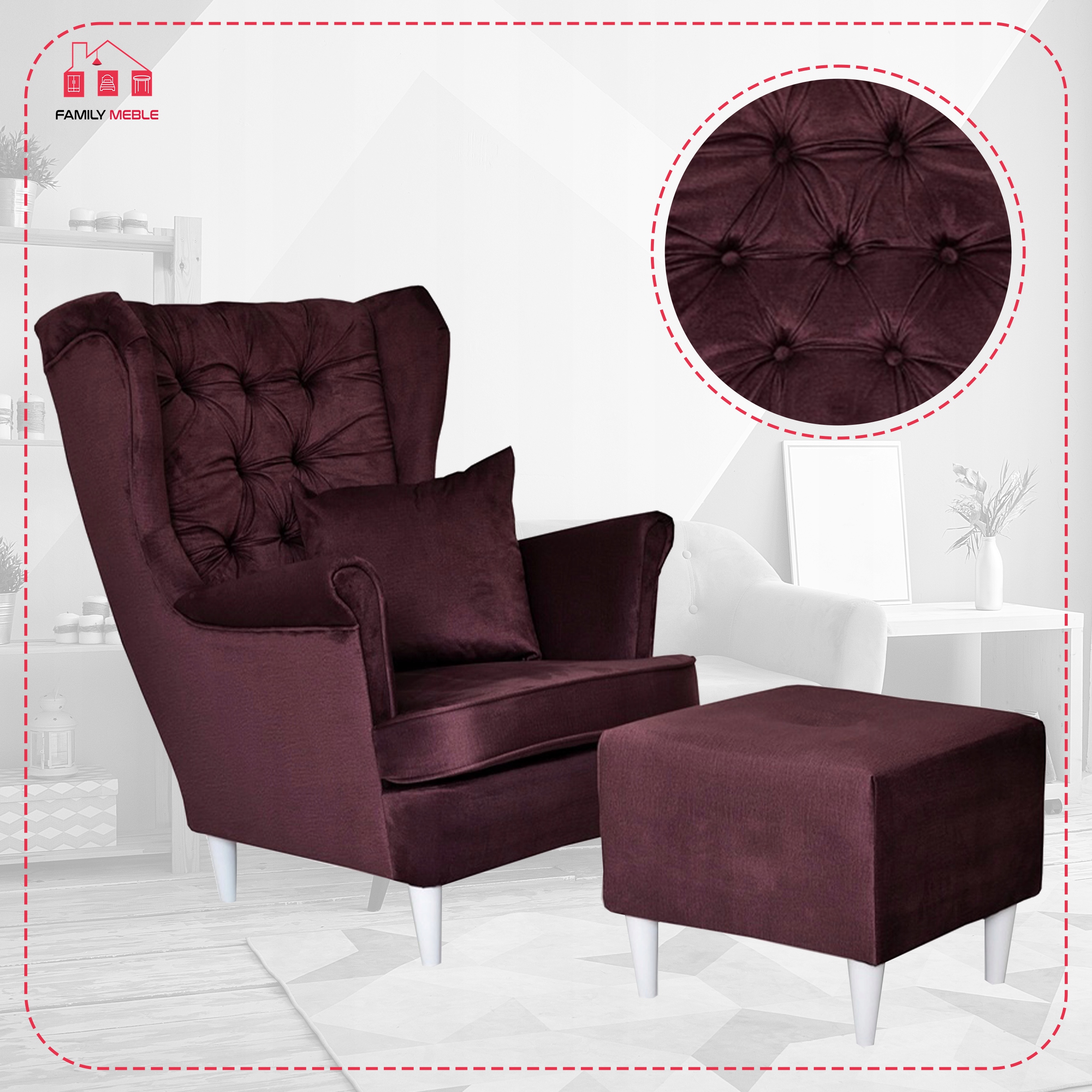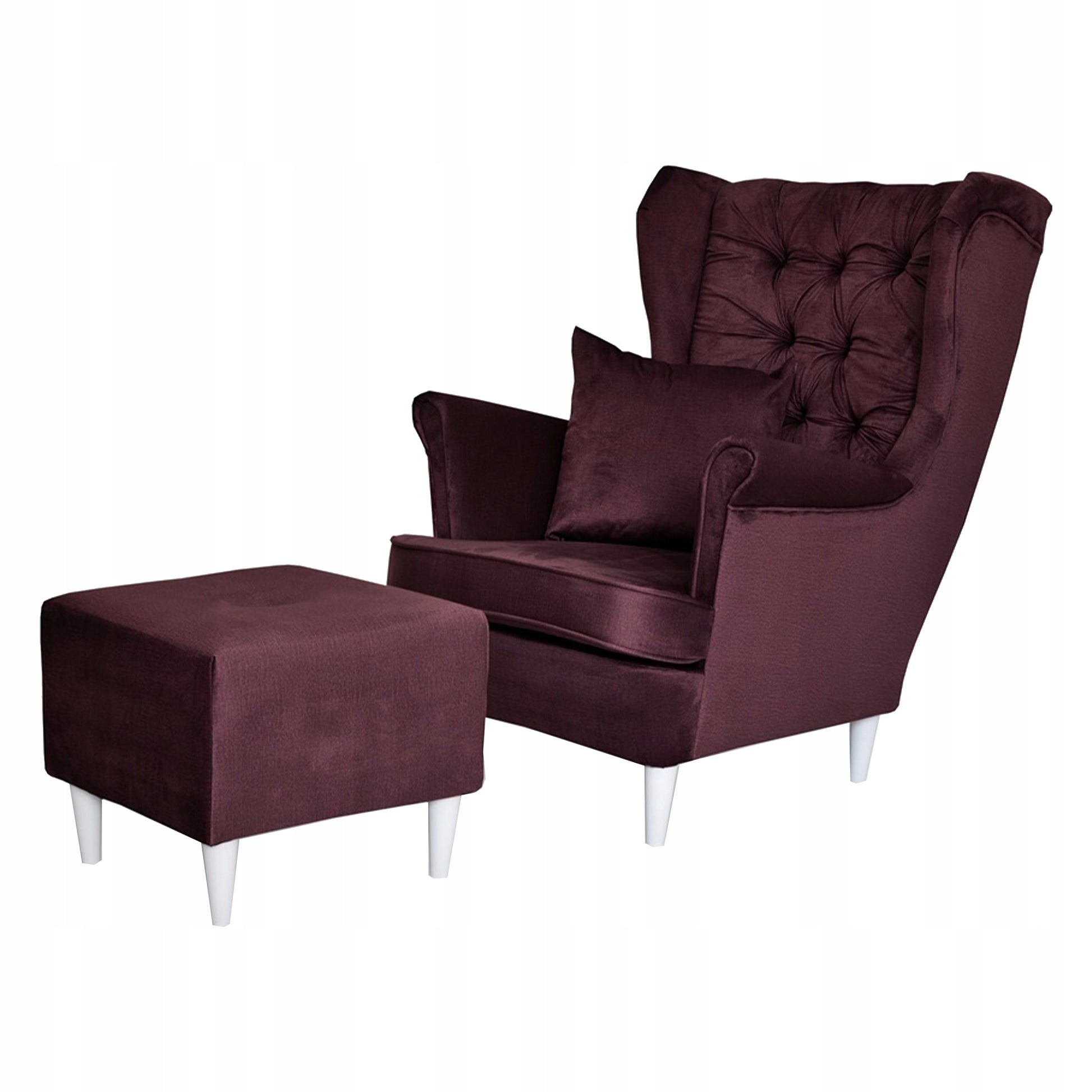 Fotel uszak Gaja z podnóżkiem skandynawski Family Meble burgund welur