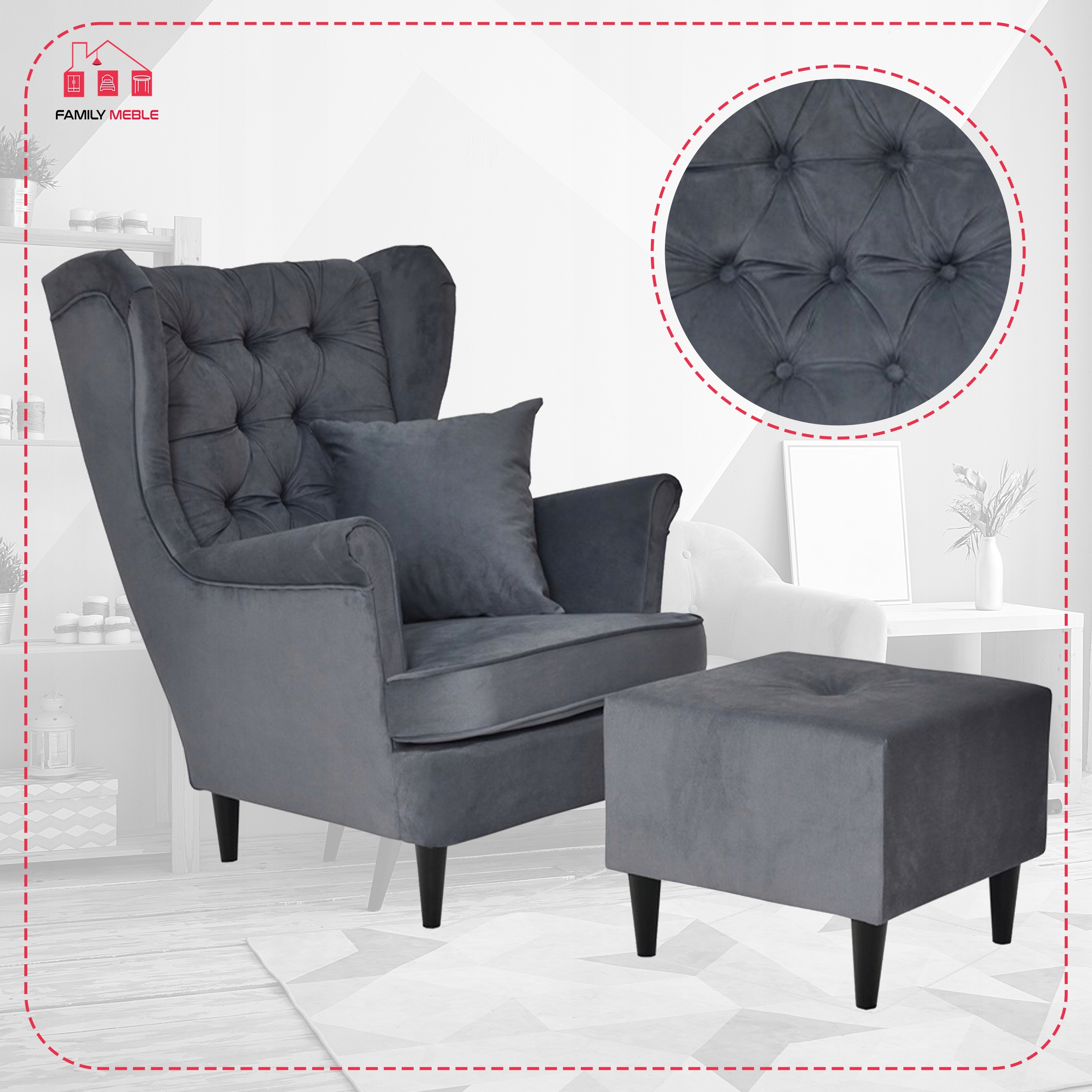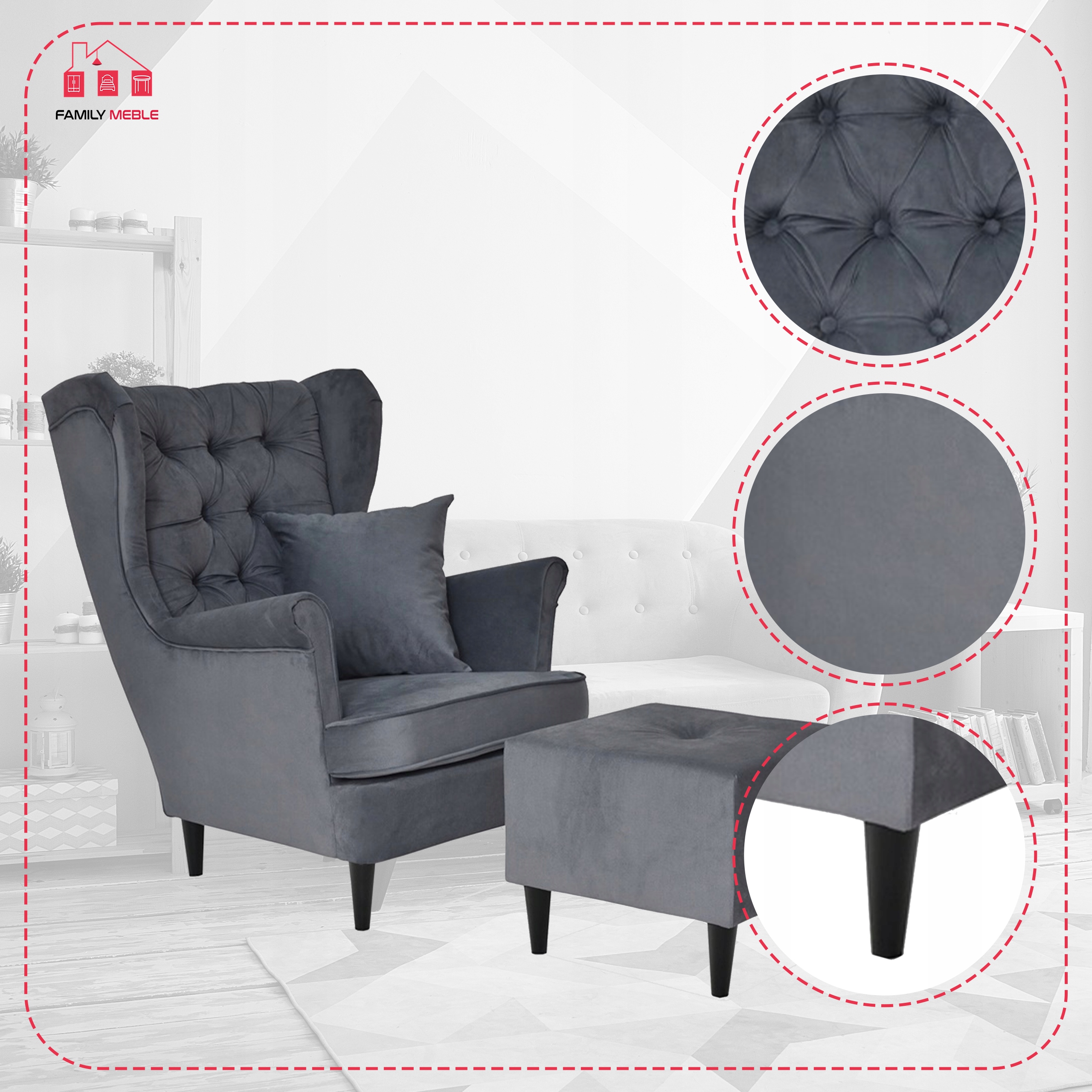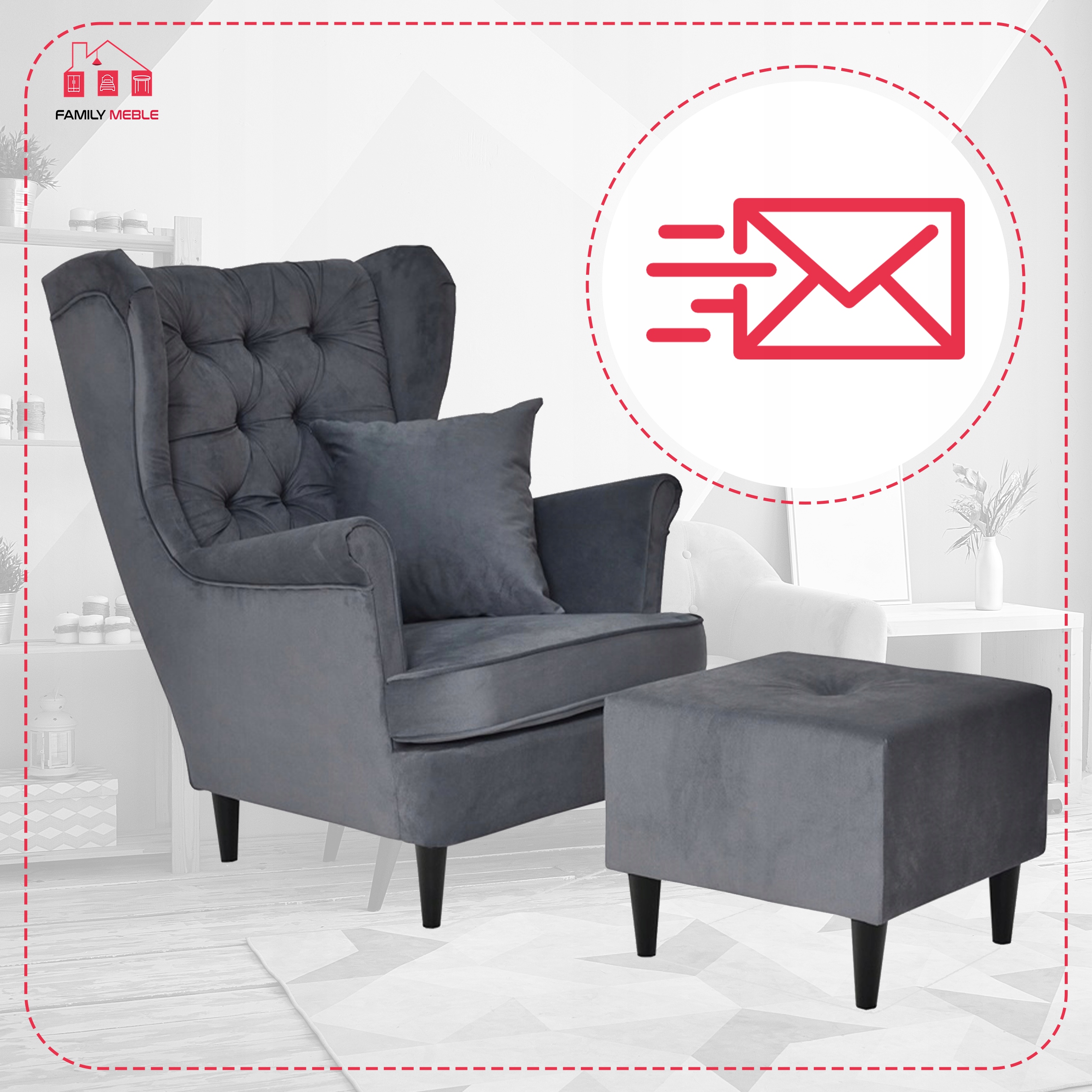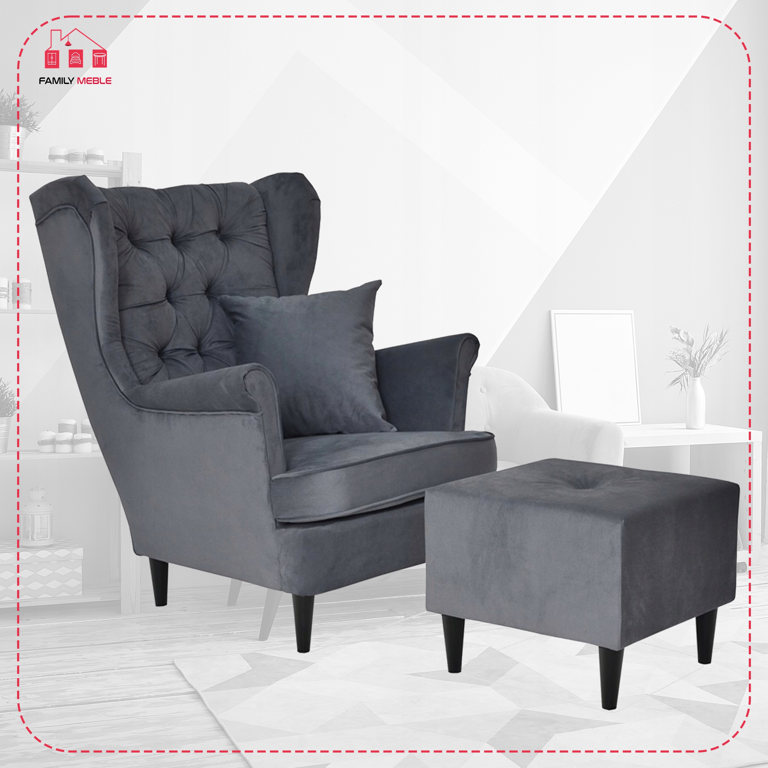 Fotel uszak Gaja z podnóżkiem, skandynawski Family Meble szary wygodny