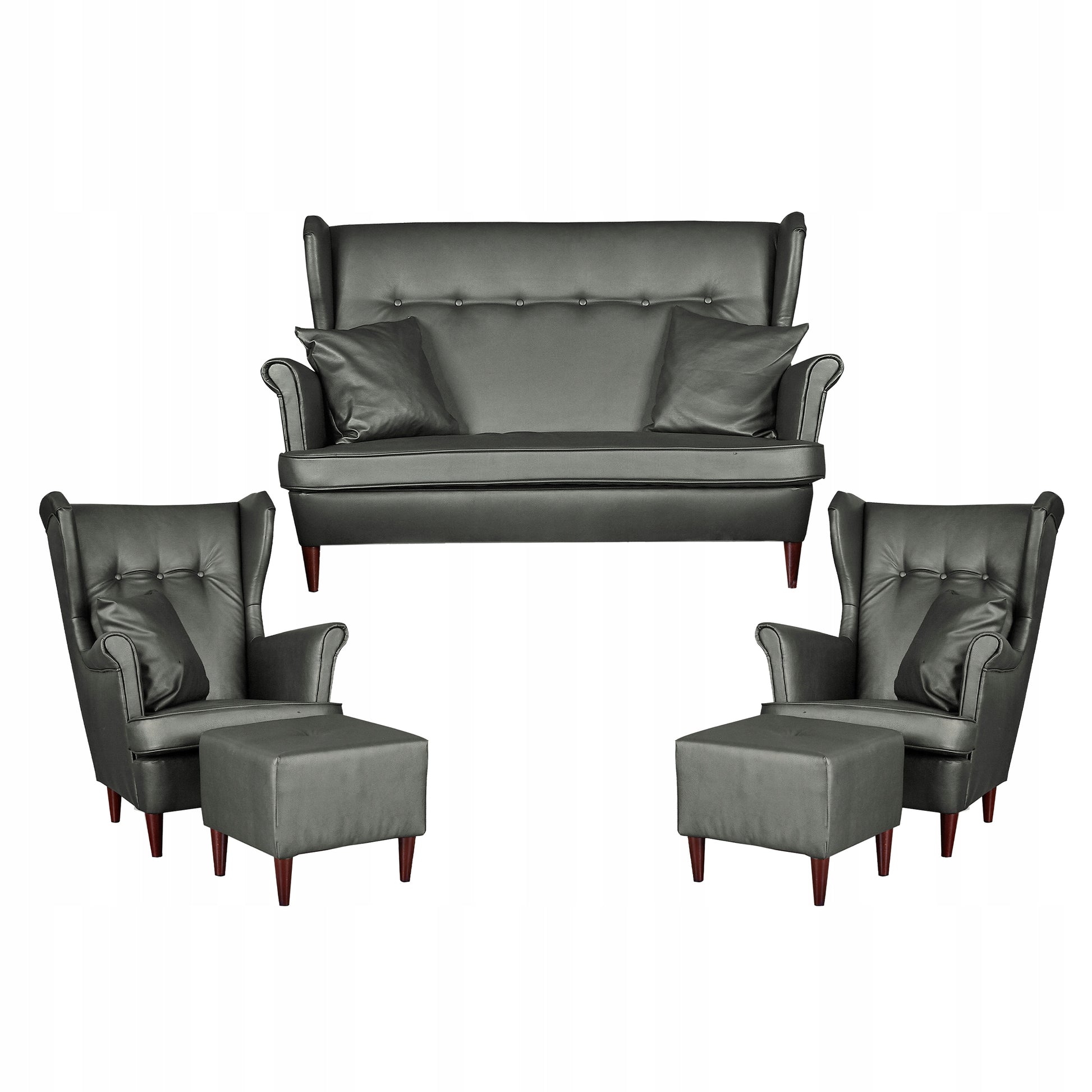 - Sofa, 2 fotele i 2 podnóżki typu Uszak na nóżkach z kolekcji eko skóra