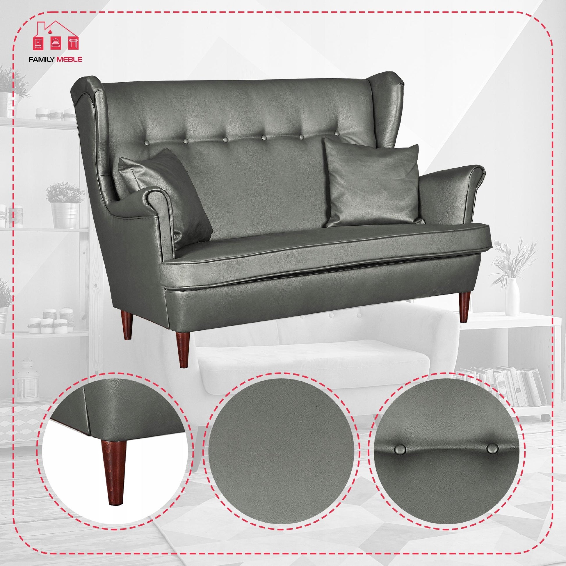 Klasyczny design sprawia, że sofa typu Uszak dopasuje się do każdego wnętrza, zarówno urządzonego tradycyjnie, jak i w bardziej nowoczesny sposób. Niezwykle wygodna, doskonale sprawdza się w salonach, gabinetach, a nawet pokojach dziecięcych, gdzie często stawiana jest przez kobiety karmiące piersią. Wykonana z odpornej ekoskóry mebel sprawdzi się także na recepcjach, w poczekalniach oraz salonach kosmetycznych.